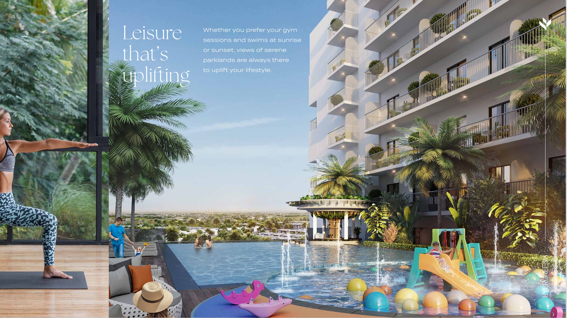Evergreens at Damac Hills 2 (D2) is the latest residential development crafted by Damac Properties, offers 1 and 2-bedroom apartments within the bustling cityscape of Dubai. This G+7 tower overlooking the picturesque parklands of Damac Hills 2. Its prime location ensures seamless connectivity to major highways, including Al Qudra Road, providing easy access to key landmarks. Residents can immerse themselves in a water-filled lifestyle with amenities like Malibu Beach and a wave surfing simulator. With superior comfort and a plethora of recreational facilities, the façade promises residents a life of leisure and indulgence.Rising elegantly with a crisp white facade against the backdrop of natural surroundings, it stands as a symbol of simplicity and elegance. From your private balcony, witness the allure of dawn's first light and the serene glow of twilight, each moment painting a picture of beauty on life's canvas. Step out into nature, where your balcony becomes an elevated natural space, offering a daily celebration of elevated living, with breathtaking views right at your doorstep.For those seeking leisure and wellness, the development offers more than just a residence; it presents an uplifting lifestyle. Picture your mornings beginning with gym sessions and swims amidst picturesque parklands, or your evenings filled with movies under the stars at the outdoor cinema. This is a place where every moment is designed to rejuvenate and uplift, where residents can truly embrace the essence of modern living.As you consider your next step in the property market, think beyond the ordinary and embrace the extraordinary. Your water wonderland awaits in Water Town, with attractions like the massive Malibu Beach, a wave pool, a splash pad, slippery slides, and more. Imagine lazing the day away on a lazy river attraction or finding your Zen in the tranquil Zen Garden. This is not just a place to live; it's a place to thrive, to create unforgettable memories, and to build a future filled with possibilities.