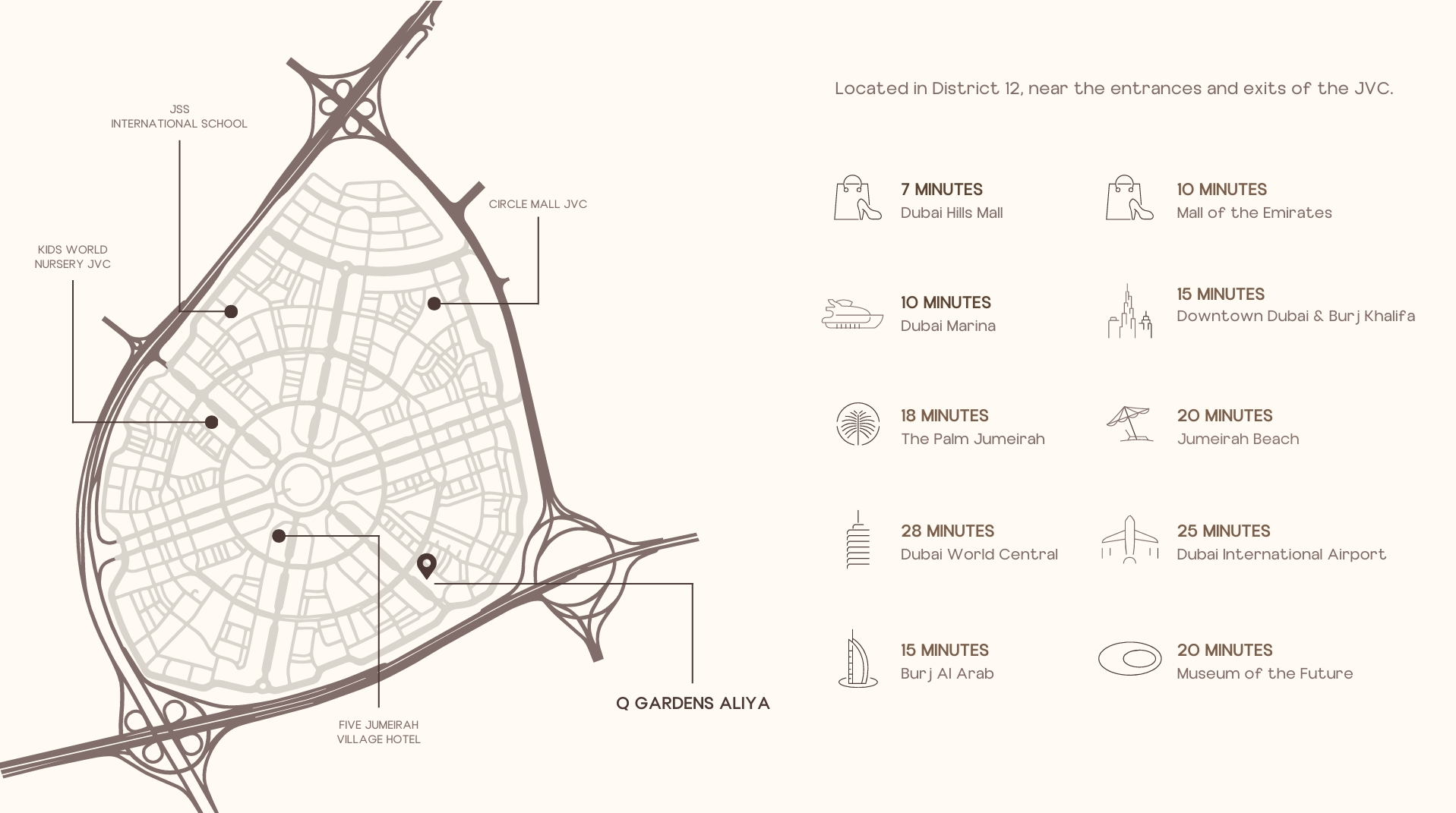 The luxurious residential complex Q Gardens Aliya by AYS Developers is located in Jumeirah Village Circle – one of Dubai’s most prestigious family-friendly neighborhoods. Known for its gated communities, green parks, and picturesque water canals, JVC offers a perfect balance between tranquility and urban convenience, making it an ideal place for both living and investing.Jumeirah Village Circle is a rapidly developing area that provides residents with jogging and cycling tracks, a modern sports complex, shopping centers, and cozy cafes. In 2021, the district ranked first in Dubai for the number of property sales, highlighting its popularity among buyers and investors. Thanks to excellent connectivity, residents have easy access to Al Khail Road. Mall of the Emirates is only 7 minutes away, while Dubai Marina, JBR Beach, and major tourist destinations can be reached within 20-25 minutes.