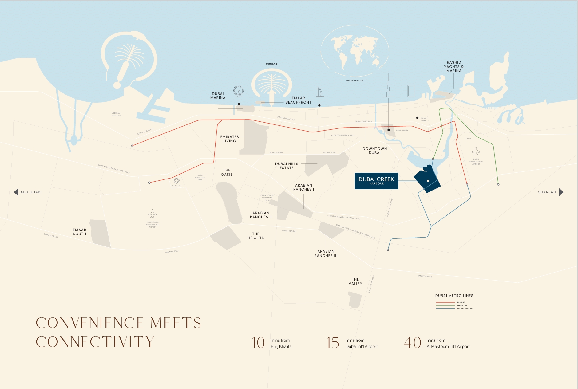 Albero by Emaar Properties is the first project in the Green Gate district – an Emaar master-planned community at Dubai Creek Harbour.Albero is a stylish and sophisticated residential development featuring 479 units, which include 1-3 bedroom apartments and 3-bedroom townhouses, all offering views of the city, creek, or golf course.Albero is located in the Green Gate neighbourhood of Dubai Creek Harbour. Dubai Creek Harbour is connected to the Green Line of Dubai’s Metro network and will benefit from future links to the Blue Line. This convenient location is just 10 minutes from Burj Khalifa and Festival City, 15 minutes from Business Bay and Dubai International Airport, and 40 minutes from Al Maktoum International Airport.Nearby popular destinations include Creek Beach, Creek Marina, Harbour Promenade, Central Park, The Viewing Point, and Ras Al Khor Flamingo Sanctuary. Leisure spots include Creek Marina Yacht Club, Al Badia Golf Course, Festival City Mall, and Festival Arena. The nearest schools include Diera International School (9 minutes by car), Universal American School (11 minutes by car), The City School International (11 minutes by car), and Maple Bear Nursery Creek Harbour (14 minutes by car). Convenient access to medical and healthcare services is available at HealthHub Day Surgery Center, Nad Al Hamar Health Center, and Life Pharmacy, all 11 minutes away by car, and Zeinat Eltigani Beauty Salon is accessible in 13 minutes.