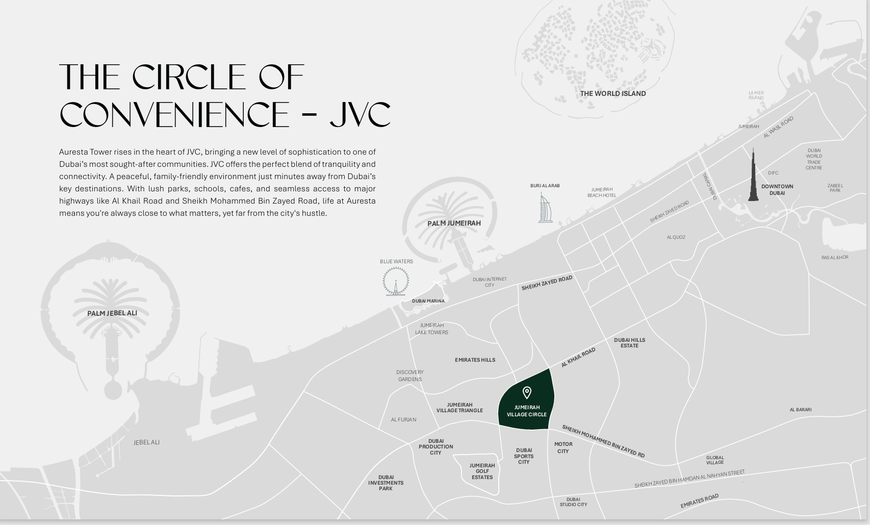 Auresta Tower by Tiger Properties is an ultra-modern residential skyscraper in the prestigious Jumeirah Village Circle. This development from one of the UAE's largest real estate companies seamlessly combines architectural expressiveness, premium finishes and flexible investment terms. The 63-storey complex, rising 255 metres, ranks among the top five tallest residential buildings in the developer's portfolio and blends seamlessly into the neighbourhood's skyline.Property at Auresta Tower at JVC consists of 568 studios, 202 one-bedroom apartments, 40 two-bedroom apartments and just four three-bedroom duplexes located on the upper floors of the skyscraper. All units are fully furnished and equipped with kitchen appliances, designer finishes and smart climate control systems. The layouts are ergonomic, with sizes ranging from 330 sqft (31 m²) to 1,235 sqft (115 m²). There are also beautiful views of the cityscape from the windows. Natural materials such as travertine, calacatta, wenge and bronze have been used to finish the bathrooms and kitchens. The well-thought-out concept emphasises the premium quality of the apartments at Auresta Tower by Tiger Properties.Property owners can enjoy all the amenities of the project, including an outdoor swimming pool with a terrace and sun loungers, a jacuzzi, a gym, a sauna and hammam, tennis and basketball courts, running and cycling tracks, a yoga area, barbecue areas and several gardens. There is a dedicated play area and a shallow pool for children. The complex also includes 7 levels of indoor parking, 4 floors of office space and a commercial area on the podium, making property at Auresta Tower by Tiger Properties an exceptional place for comfortable living and a well-designed working environment.The location is one of the project's significant advantages. Jumeirah Village Circle is a green area with a phased completed infrastructure, where residential and public spaces coexist. Just a 5-minute drive from the complex is Circle Mall with a Spinneys supermarket, restaurants and boutiques. The area is home to JSS International School, Nord Anglia, Mediclinic Parkview and Right Health medical facilities, fitness clubs and beauty salons. The district is conveniently located relative to popular destinations in the emirate. Dubai Marina, Downtown Dubai and Palm Jumeirah are 15-20 minutes' drive away, while Dubai Intl. Airport is approximately 25 minutes' drive away via Al Khail Road or Sheikh Mohammed Bin Zayed Road.
