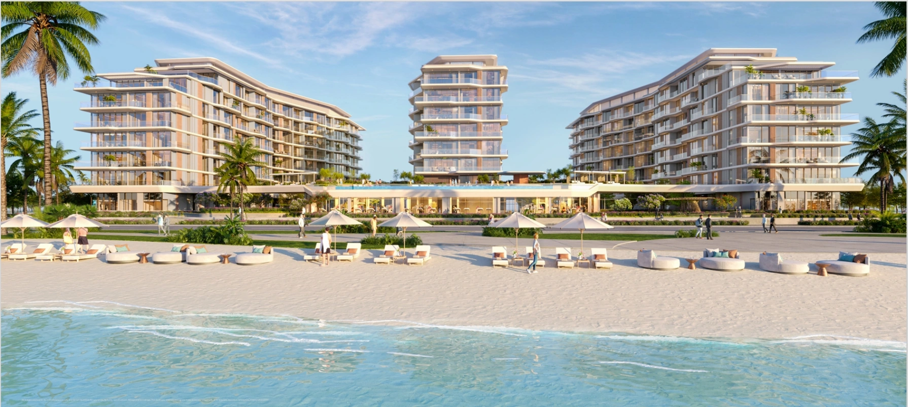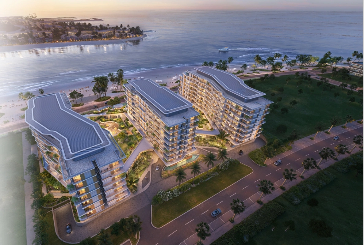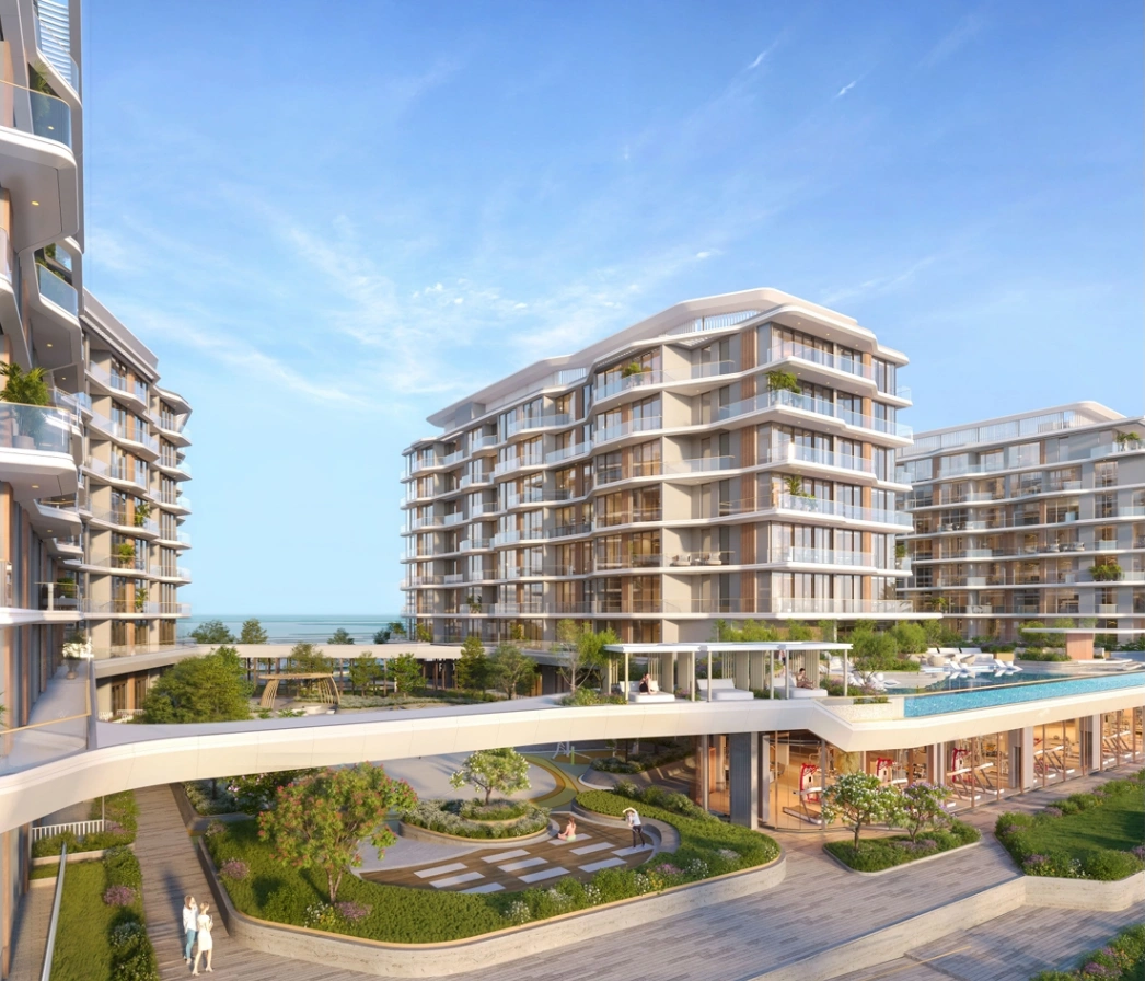 The complex comprises three towers up to 9 stories high with spacious apartments, each offering panoramic views of the Persian Gulf.Residents enjoy premium amenities, including lagoon-style pools, fitness and wellness centers, sauna and spa, yoga areas, children’s play zones, BBQ areas, and beautifully landscaped walking and promenade paths along the waterfront.
