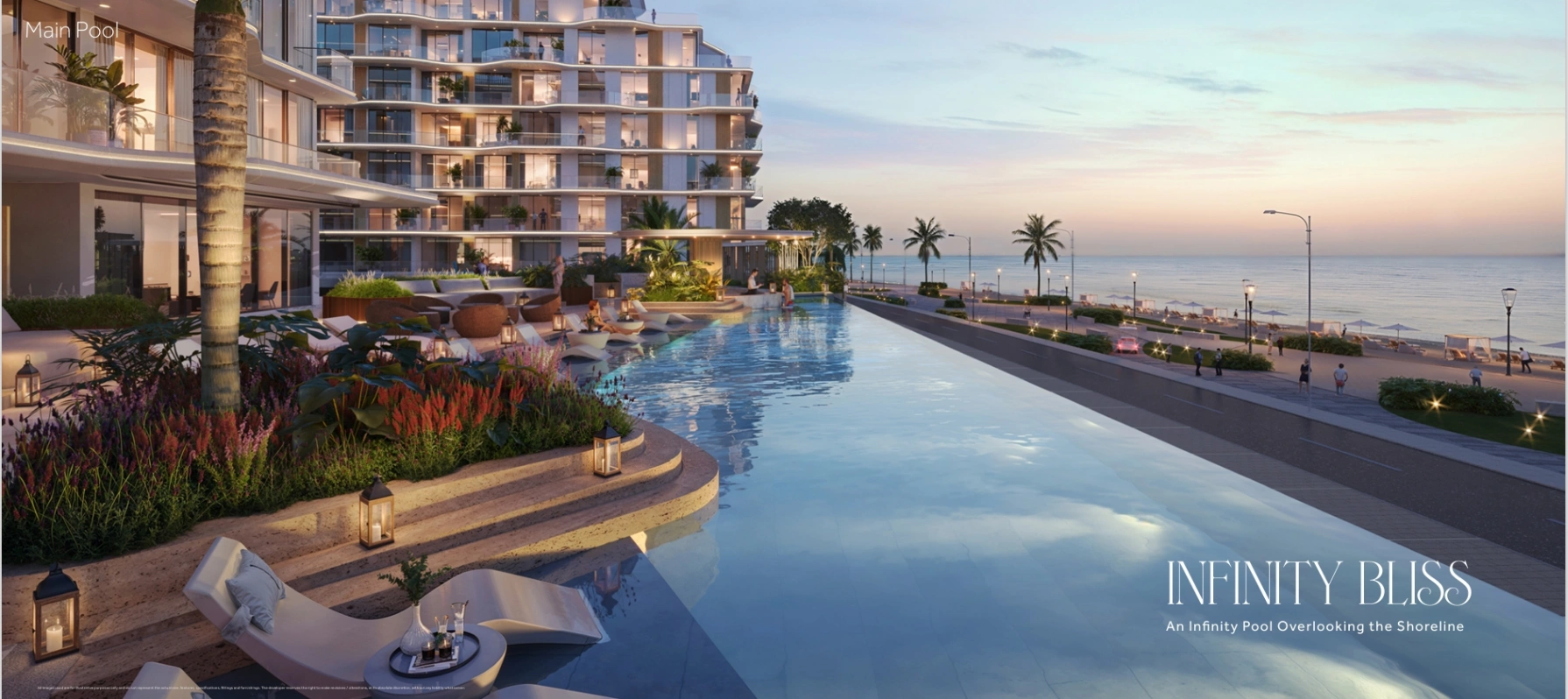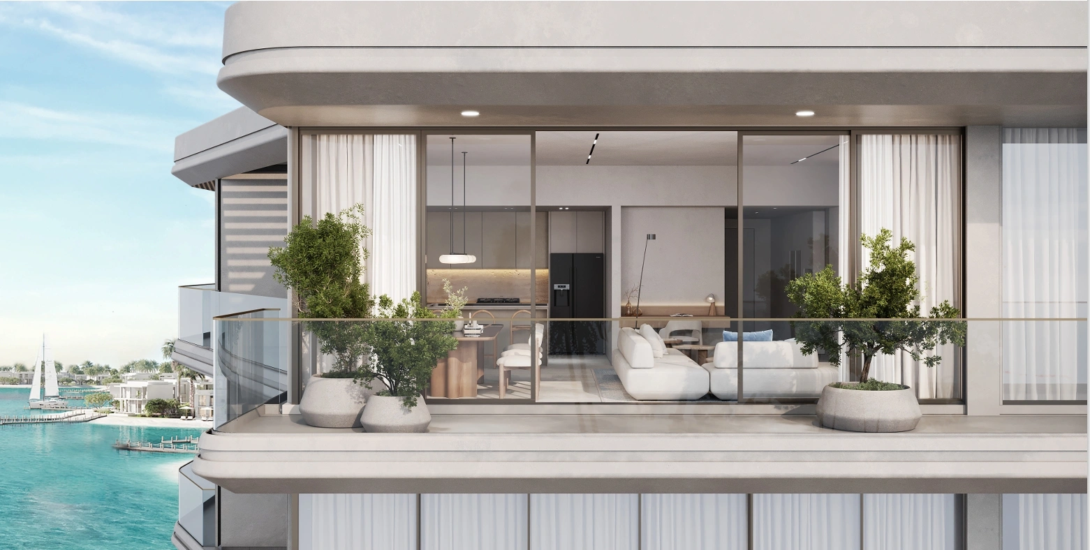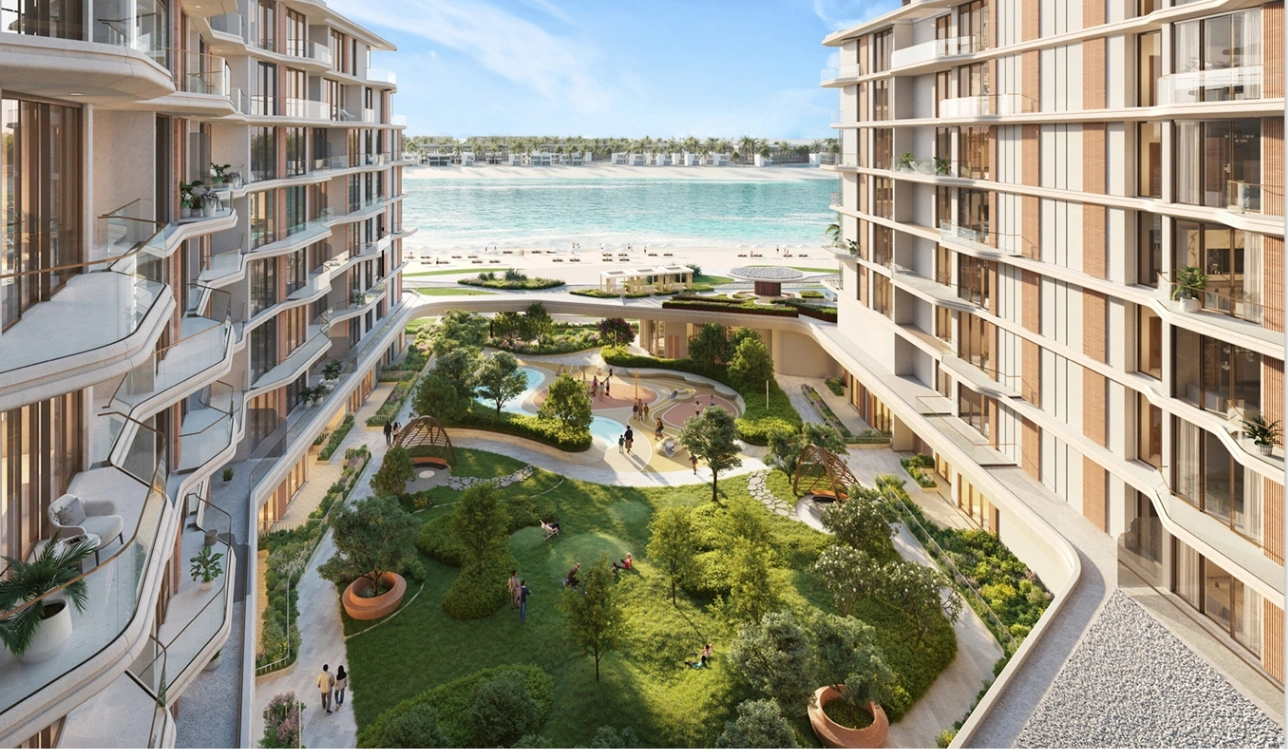 The complex comprises three towers up to 9 stories high with spacious apartments, each offering panoramic views of the Persian Gulf.Residents enjoy premium amenities, including lagoon-style pools, fitness and wellness centers, sauna and spa, yoga areas, children’s play zones, BBQ areas, and beautifully landscaped walking and promenade paths along the waterfront.