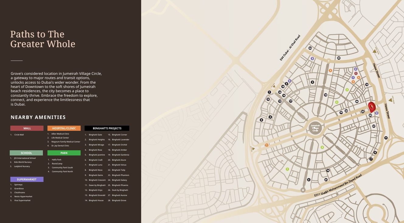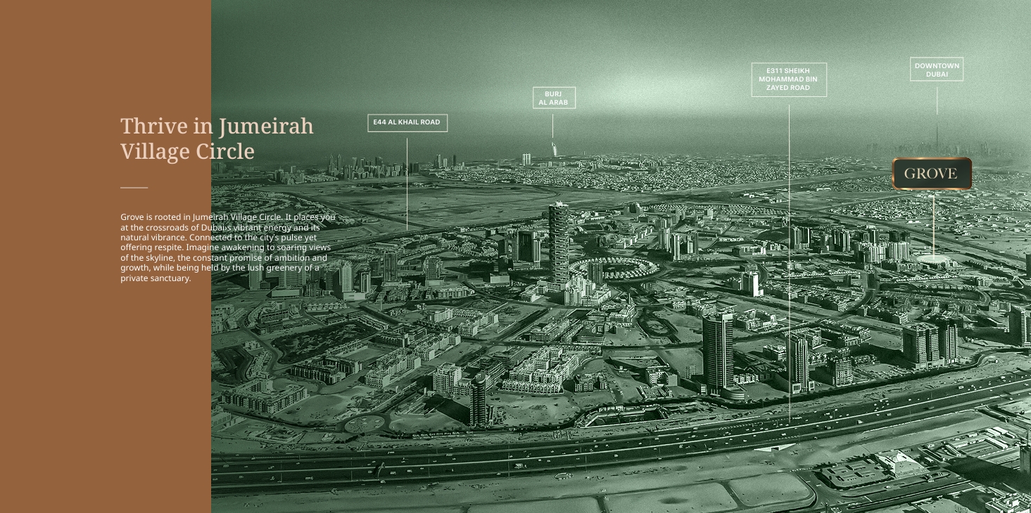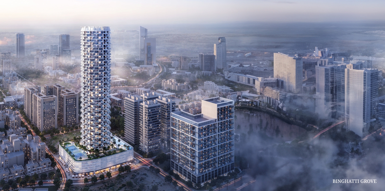 Binghatti Grove, a prestigious residential project by Binghatti Developers, is located in the highly sought-after Jumeirah Village Circle (JVC) in Dubai. This development offers a range of luxurious apartments designed to meet the demands of modern urban living. Binghatti Grove features 1, 2, and 3-bedroom apartments, with sizes ranging from 78 m² (840 sqft) to 214 m² (2303 sqft). The design of Binghatti Grove blends modern architectural aesthetics with functional living spaces, using high-quality materials such as marble, glass, and wood to create a sophisticated environment. The apartments are thoughtfully planned, with an emphasis on maximizing space and natural light. Kitchens are equipped with state-of-the-art fittings, making them both practical and stylish, catering to the modern homeowner’s needs. The interiors reflect contemporary design principles, with sleek lines and finishes that create a comfortable and inviting atmosphere. Residents can enjoy high-end finishes throughout the units, with attention to detail evident in every aspect of the design.Binghatti Grove offers a range of amenities designed to elevate the living experience of its residents. The development features a state-of-the-art gymnasium, providing a space for fitness enthusiasts to maintain their workout routines. An infinity swimming pool adds a touch of luxury, offering a tranquil place to unwind. The landscaped parks and lush green spaces scattered throughout the development allow residents to enjoy nature and relax in a serene environment. For families, there are dedicated children’s play areas, ensuring that younger residents have safe spaces for recreation.Residents can also enjoy outdoor gatherings with barbecue stations, perfect for socializing with family and friends. Retail and dining options are conveniently located within the development, providing easy access to everyday essentials and culinary delights. The inclusion of on-site healthcare facilities adds to the convenience, catering to residents’ well-being. Security is a top priority, with advanced systems including CCTV monitoring, ensuring a safe and secure living environment. These amenities come together to create a balanced and comfortable lifestyle for families, couples, and professionals, blending modern living with relaxation and convenience.Jumeirah Village Circle (JVC) is a highly sought-after residential area in Dubai, recognized for its family-oriented atmosphere and superb connectivity. The area is well-connected by major highways, including Sheikh Mohammed Bin Zayed Road and Al Khail Road, making commuting to various parts of the city effortless. Binghatti Grove enjoys a prime location within JVC, offering residents easy access to some of Dubai’s most prominent destinations. With close proximity to Dubai Marina, Mall of the Emirates, and Downtown Dubai, it allows residents to reach these major hubs within minutes. The development is also conveniently located for international travelers, with Dubai International Airport just a short drive away.The community at Jumeirah Village Circle (JVC) offers a wide range of local amenities that cater to the needs of its residents. These include the Circle Mall, which provides various retail outlets, dining establishments, and entertainment facilities. In addition, JVC boasts several schools, nurseries, and healthcare centers, making it an excellent choice for families looking for convenience and quality services.For those interested in leisure and recreation, JVC is equipped with numerous parks, jogging trails, and fitness centers, helping residents maintain an active and healthy lifestyle. Close to the development, popular attractions such as Dubai Miracle Garden and Ski Dubai are easily accessible, offering additional entertainment options.JVC is known for its strong investment potential, with properties offering an attractive Return on Investment (ROI) averaging between 6-7%. Binghatti Grove, with its premium location and modern amenities, is expected to be highly appealing to investors and end-users alike. The mix of residential and retail offerings within JVC makes it a vibrant community, further driving demand for property in the area.Apartments at Binghatti Grove by Binghatti Developers is a promising investment option in Jumeirah Village Circle. Its modern design, premium amenities, and strategic location offer excellent potential for both personal use and investment, making it a valuable opportunity in Dubai’s thriving real estate market.