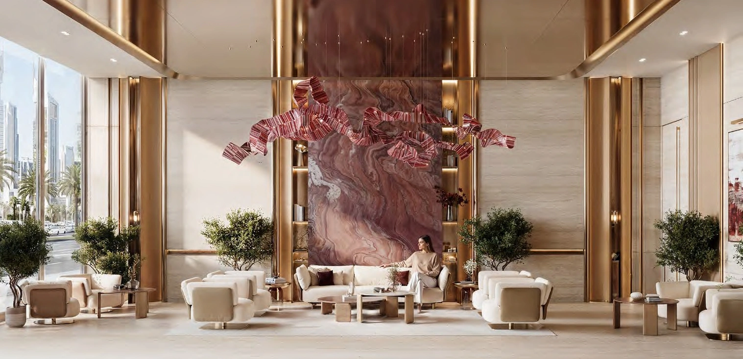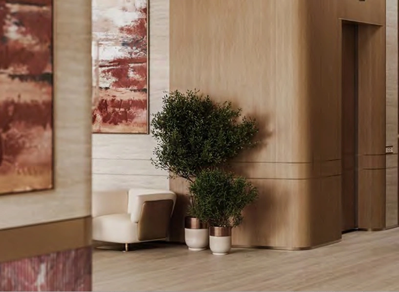 The interior design of properties at Binghatti Etherea uses neutral, warm tones. Large-format tiles resembling natural stone are planned for the floors, while the walls will feature simple but high-quality coverings, with the possibility of decorative panels resembling wood or travertine. Built-in wardrobes covering the entire height of the walls help to make efficient use of space. An important part of the concept is the kitchen and living room as a single space. Kitchens are planned with an island or peninsula, stone countertops, sleek facades, and built-in appliances. Thoughtful lighting makes the work area comfortable and functional.