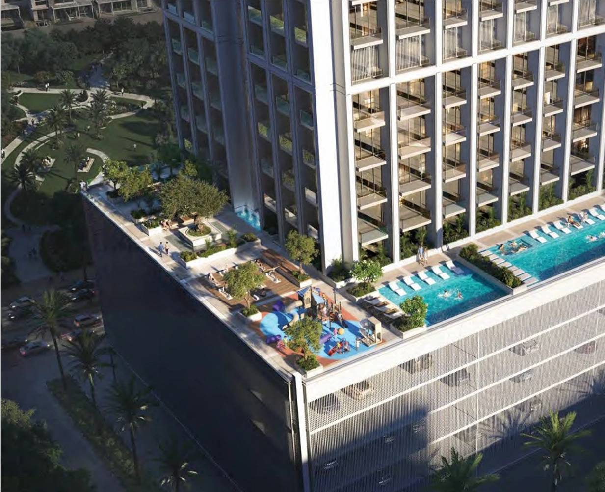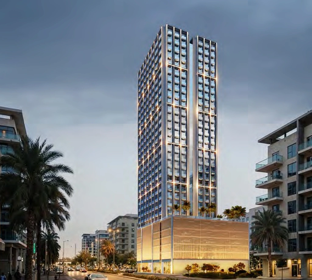 Binghatti Etherea is a new residential development at Jumeirah Village Circle in Dubai. The project is located in the heart of the neighborhood and includes studios, one- and two-bedroom apartments, and several commercial units at the podium level. The building is designed with an underground floor, a basement, 5 floors for parking, and 22 residential floors.The architecture of Binghatti Etherea is contemporary in style. The facade has a recognizable silhouette with protruding elements that create volume and at the same time help protect the rooms from direct sunlight. Light colors and metallic details with a soft sheen are used. The upper floors form a kind of “crown.” The windows in all apartments at Binghatti Etherea are oriented to maximize natural light and open up views of the surrounding area.The amenities at Binghatti Etherea have been carefully thought out. The 5th floor will feature a communal level with an outdoor swimming pool for adults, a separate children's pool, a jacuzzi, and relaxation areas with sun loungers. There will also be an open-air children's playground, walking and jogging paths, and areas for yoga and stretching. The project will feature cozy lounges for quiet relaxation with greenery and water features. There will be a separate sports area with a gym, which will offer panoramic views of the city thanks to its floor-to-ceiling windows.