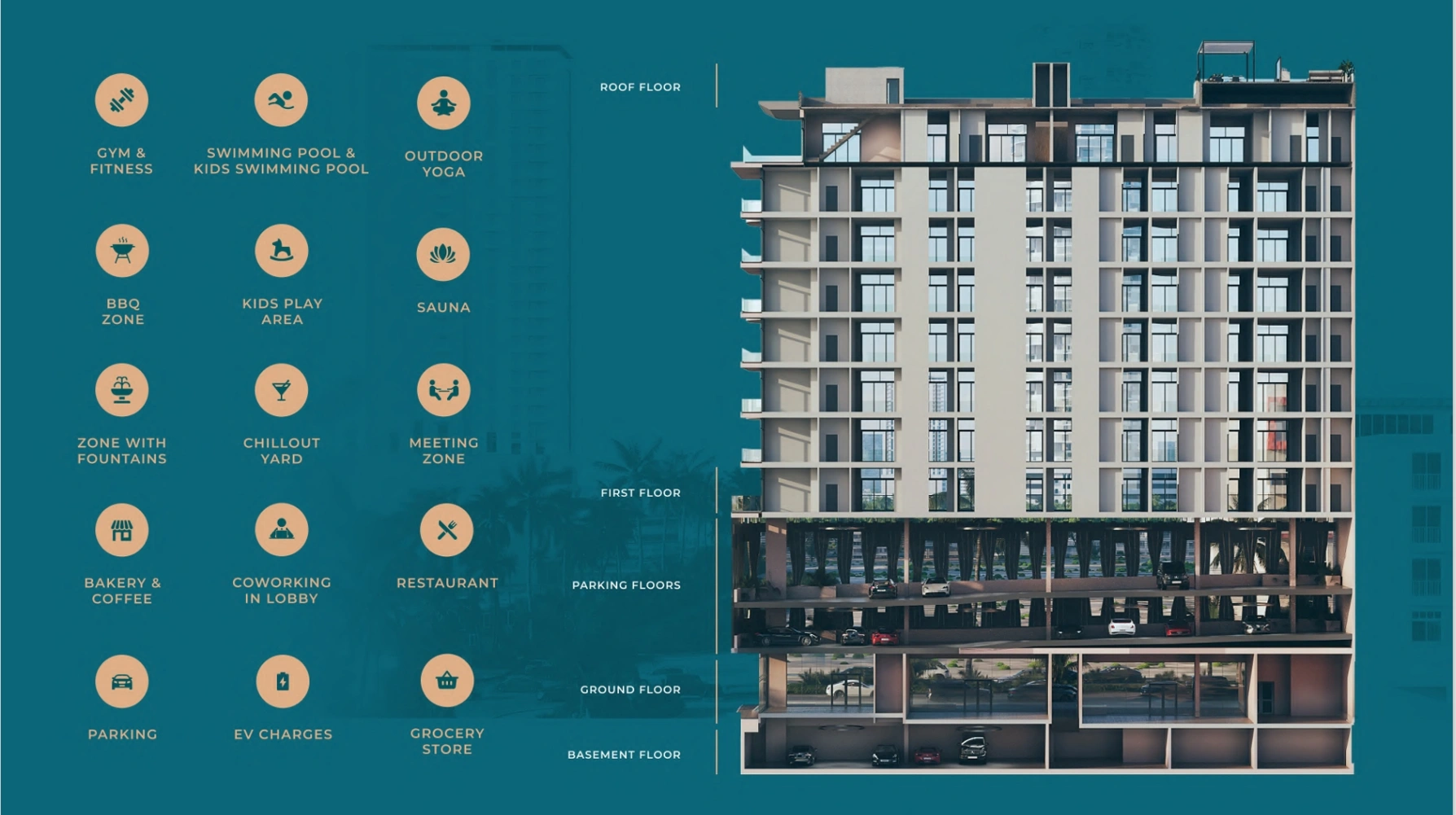 Vitality Residence by Segrex Development combines modern architectural design with well-planned living spaces, offering a contemporary lifestyle in the thriving community of Jumeirah Village Circle (JVC). Developed by Segrex Development, this residential project caters to professionals, families, and investors seeking a balanced and connected living experience. With studio apartments starting from 427 sqft (40 m²) and 2-bedroom units up to 1299 sqft (120 m²), the development provides a range of thoughtfully designed homes focused on comfort and functionality.Residents of Vitality Residence enjoy an array of amenities, including a temperature-controlled swimming pool, a state-of-the-art gym, outdoor yoga spaces, and a dedicated children's play area, promoting an active and healthy lifestyle.Social and leisure facilities such as BBQ zones, landscaped gardens with fountains, and a sauna add to the community's appeal. On-site conveniences, including a bakery, restaurant, and grocery store, ensure that daily essentials are easily accessible, while ample parking spaces with EV charging stations cater to modern mobility needs.