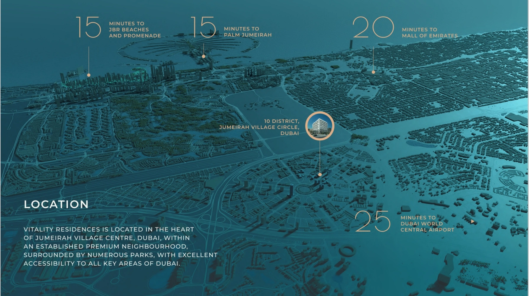 Segrex Development introduces Vitality Residence, an exclusive residential project nestled in the bustling community of Jumeirah Village Circle (JVC), Dubai. This modern development offers a selection of studios, 1-bedroom, and 2-bedroom apartments, thoughtfully designed to meet the needs of individuals, families, and investors seeking a vibrant and contemporary lifestyle with premium amenities.The project features swimming pools, a gym, yoga spaces, kids’ play areas, coworking spaces, BBQ zones, and retail options. Strategically located, it provides access to Sheikh Mohammed Bin Zayed Road and Al Khail Road, with Palm Jumeirah, Downtown Dubai, and Dubai Intl. Airport reachable within 20-25 minutes away. With modern design, premium amenities, and high rental yields, it’s a top investment choice.The architectural design of Vitality Residence emphasizes contemporary aesthetics, blending style and practicality. With large windows and balconies, the layout maximizes natural light, ventilation, and scenic views. The interiors feature high-quality finishes, including premium flooring, modern fixtures, and built-in wardrobes for stylish storage.Residents of Vitality Residence will enjoy a range of premium amenities designed to enrich daily life. A temperature-controlled swimming pool offers year-round leisure, while a state-of-the-art gym and outdoor yoga spaces cater to wellness needs. Families will appreciate the dedicated kids’ play area, providing a safe environment for children. For recreation, residents can use the BBQ zones and relax in the landscaped gardens with tranquil fountains. A sauna offers relaxation, while a meeting zone provides space for professional or community gatherings. Convenience is enhanced with a bakery, restaurant, and grocery store, ensuring access to essentials. Ample parking, including EV charging stations, supports modern mobility. Comprehensive 24/7 security measures, including CCTV and trained personnel, ensure safety and comfort for all residents.Vitality Residence ensures a connected and vibrant lifestyle, combining modern amenities with the dynamic community environment of Jumeirah Village Circle (JVC). This seamless blend of convenience, recreation, and well-being makes it an excellent choice for individuals, families, and professionals seeking contemporary living in one of Dubai’s thriving neighborhoods.