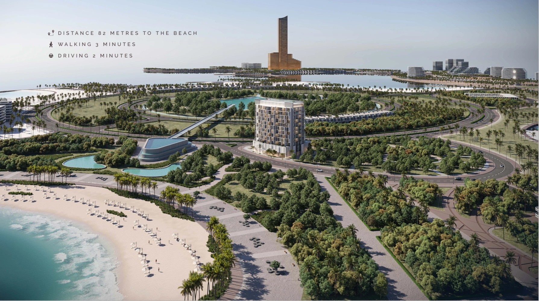 The amenities at Island Heights on Al Marjan Island are as well thought out as possible. The podium level features a 25 metre infinity pool with sundeck, bar and cosy canopied lounges. For active leisure enthusiasts, there is a fitness centre with panoramic views and a yoga studio. The complex also features a children's playground, a barbecue area, a co-working space for distance working and lawns for meditation. Each residence is assigned with one parking space.Island Heights' location on Al Marjan Island is one of the key benefits of the project. The development is just 90 metres away from the beach and within walking distance of the ongoing Wynn Al Marjan Resort, which will be the region's first resort with an interactive casino. Al Hamra Golf Club, Waldorf Astoria, RAK Central, Al Hamra Mall and Al Marjan Marina are all within a 10-15 minute drive. Ras Al Khaimah International Airport is a 30-minute drive away, while Dubai International Airport is a 45-minute drive away.