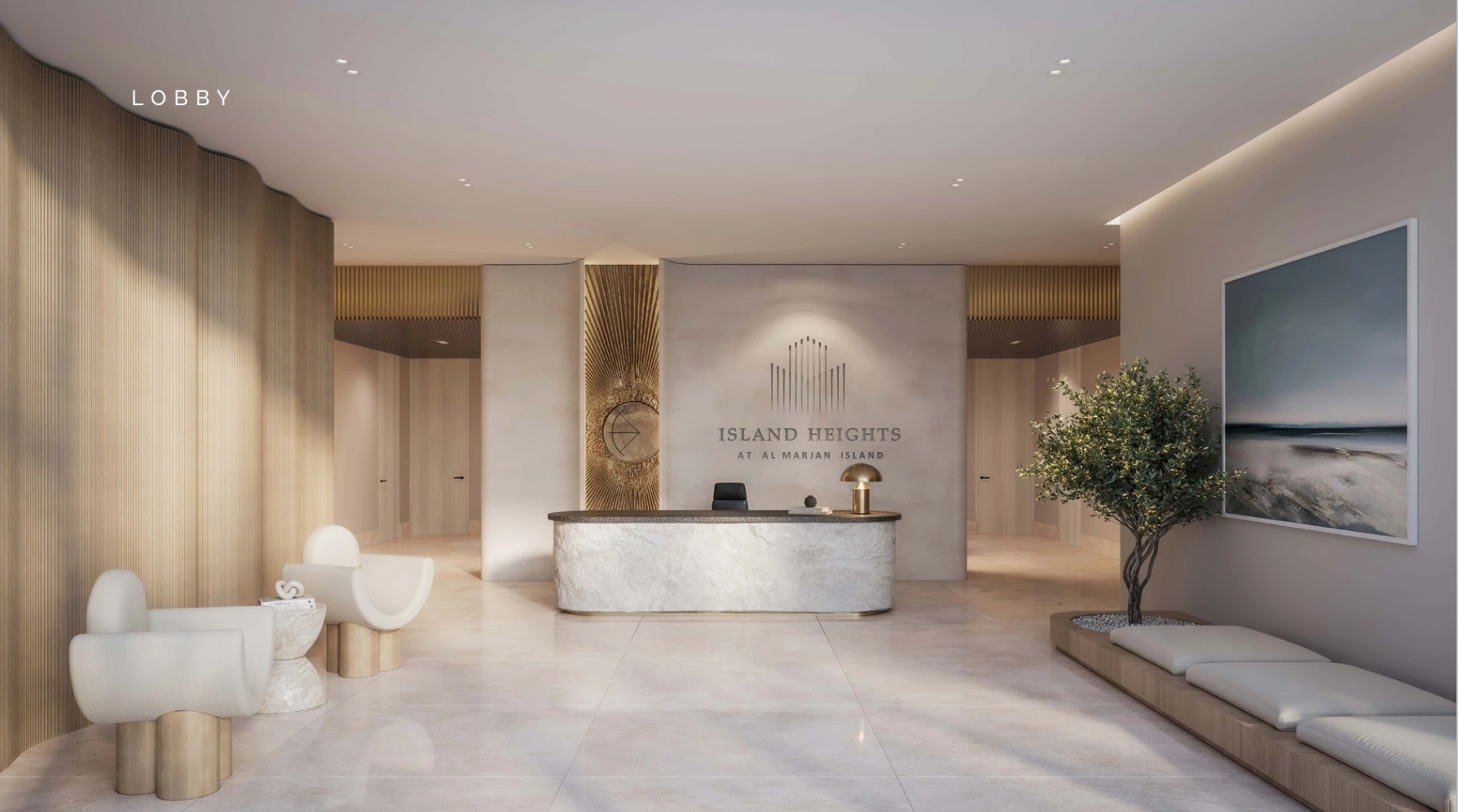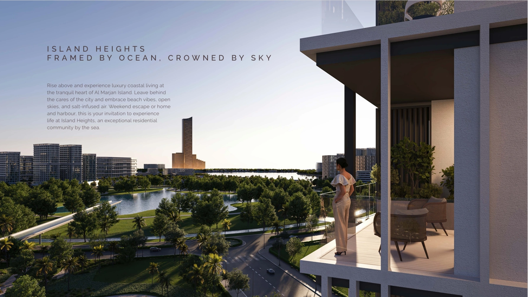 Island Heights is an elegant 10-storey residential tower located on the artificial archipelago of Al Marjan Island in Ras Al Khaimah. The developer of the complex is the well-established Range Developments, known for such projects as Park Hyatt St. Kitts and Six Senses Grenada. The architectural concept of Island Heights impresses with its clean lines and sculptural façade, where strict geometry is lightened by the rhythmic layout of balconies and panoramic windows. The project perfectly blends into the island landscape and its key feature is the 360 degree views of the Arabian Gulf, picturesque beaches and the upcoming Wynn Al Marjan Island Resort.Properties at Island Heights by Range Developments include studios and 1-bedroom apartments. In total there are 165 residences with an area from 391 sqft (36 m²) to 1,168 sqft (109 m²). Their design emphasises natural light and smooth connections between living and exterior spaces. The interiors of the apartments at Island Heights on Al Marjan Island are based on the concept of ‘timeless wonder’ — light colours, natural textures of travertine and wood, minimalist fittings. Kitchens are equipped with integrated appliances from premium brands. Bathrooms are fitted with matt tiles and chrome plumbing fixtures. Large sliding doors have been installed opening onto a spacious terrace, perfect for evening gatherings.