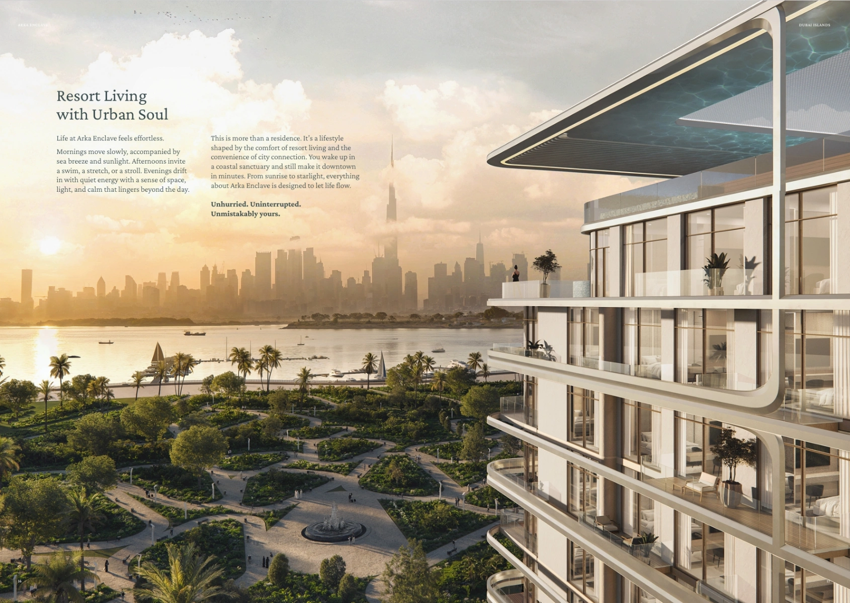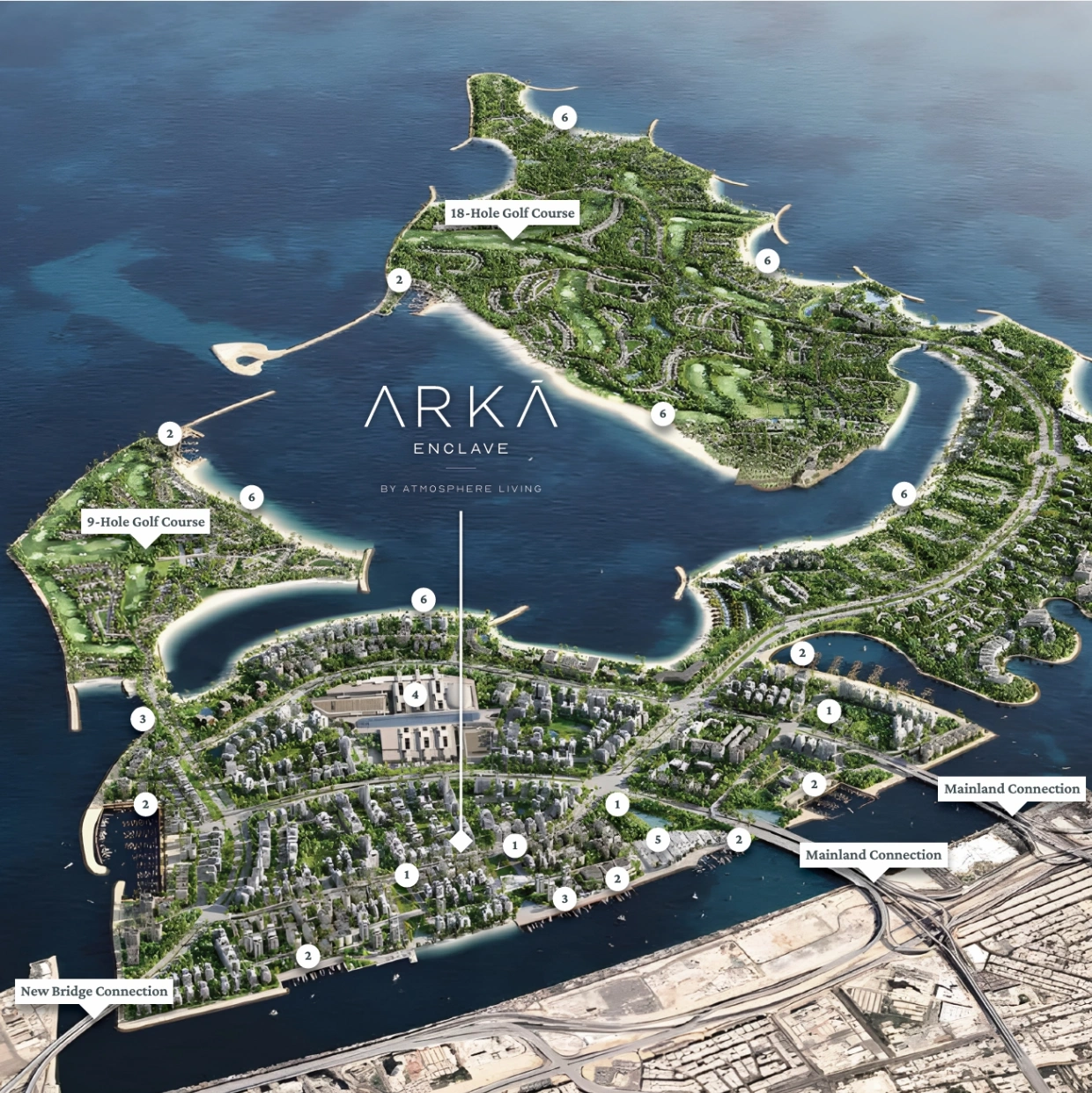 Arka Enclave by Atmosphere Living is a unique project combining the elegance and seclusion of the Maldives with the dynamics of Dubai. Located in the prestigious Dubai Islands area, this project is the perfect combination of natural tranquility and urban convenience. The residences at Arka Enclave resemble natural locations, and every detail of the interior and architecture is designed to make living here feel like a vacation on the islands, even when you don’t leave the city. This project features luxurious 1-3 bedroom apartments with a choice of layouts. These living spaces range from 766 sqft (71 m²) for 1-bedroom apartments to 2224 sqft (206 m²) for 3-bedroom options.Each residence features high-quality finishes, including natural stone and smart home systems, for convenience and comfort. The interiors feature neutral tones and organic materials, creating an atmosphere of coziness and tranquility. Kitchens with stone countertops and Siemens appliances blend perfectly with living rooms and bedrooms filled with natural light.Arka Enclave offers unique amenities for its residents, from a lagoon pool and open-air cinema to specially equipped sports grounds. There are also yoga studios, a gym, and tennis courts. The project also features high-end leisure areas, including an elite club and massage rooms. For those who enjoy active recreation, there are running tracks and children's play areas.