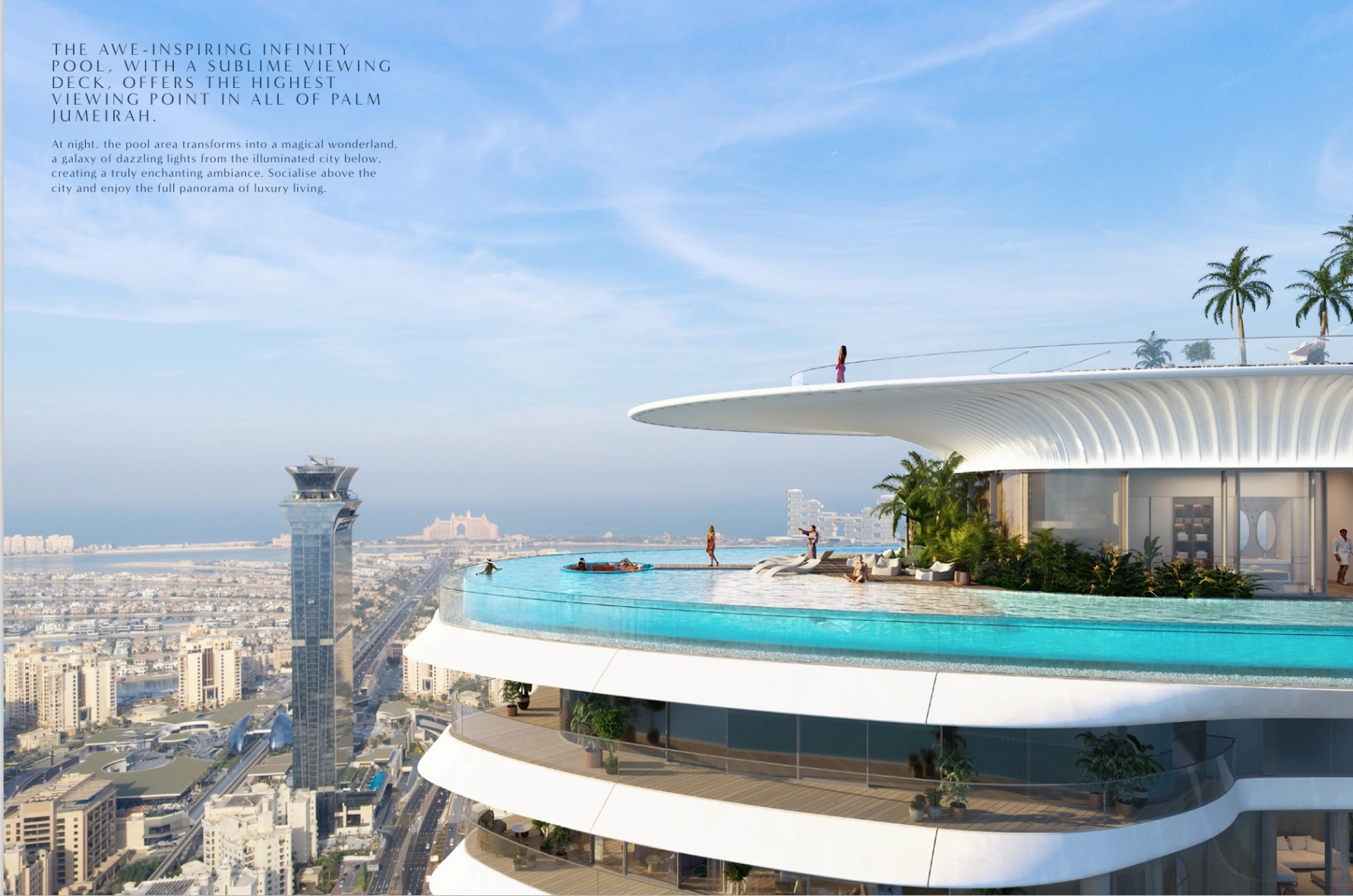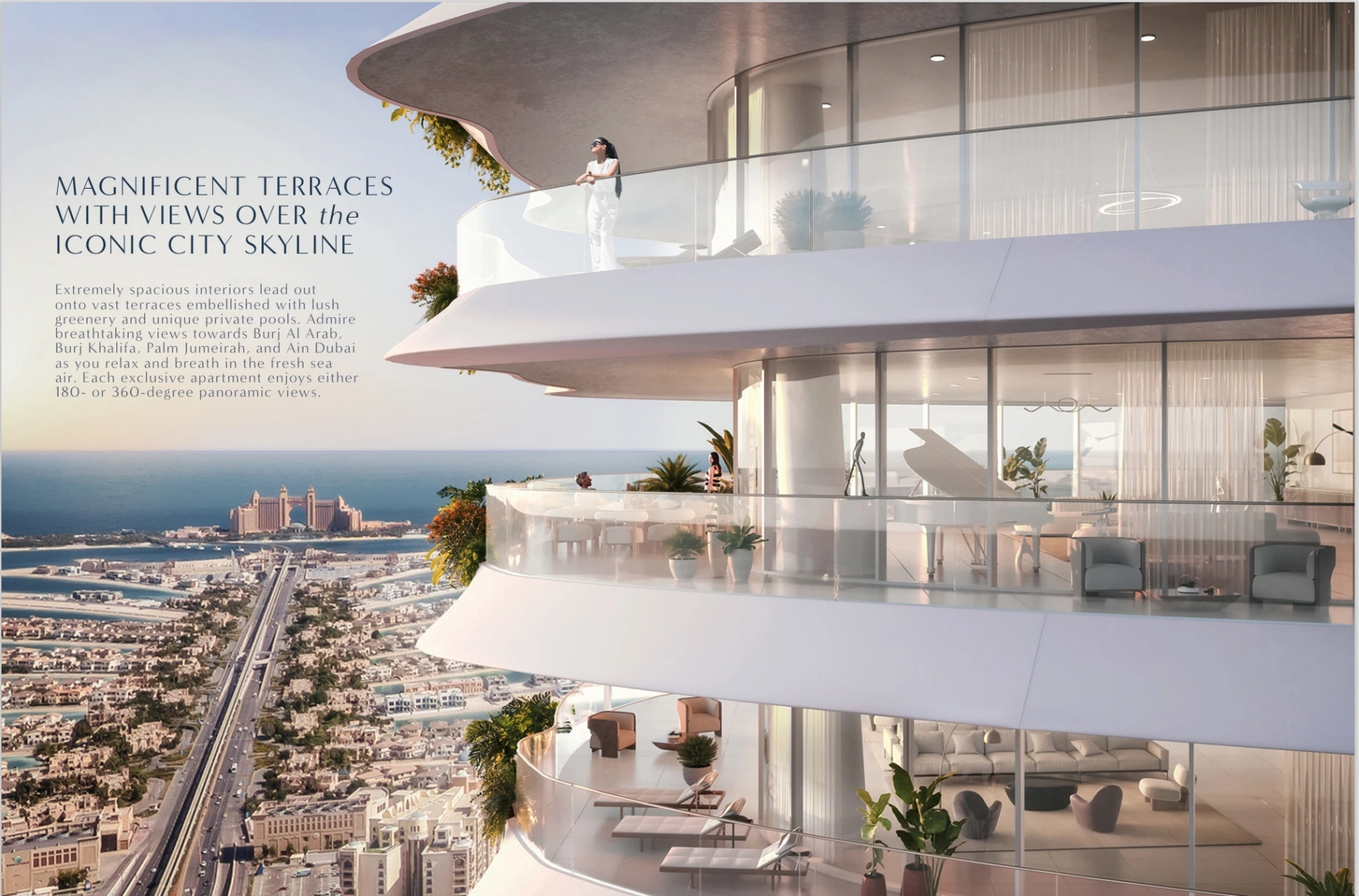 Experience living in a collection of exceptionally designed spacious residences in the sky, where the high-end interiors come with exclusive features. Each of these luxury residences becomes a haven of peace and tranquillity, above the dazzling blue sea. Feel the romance in the air, where the grandeur of living in one of the exclusive kind is available at your service enjoying the lovely moment of life.This Palm Jumeirah newest landmark allows its residents a truly world-class lifestyle, exploring a series of sweeping terraces and glistering pools and verdant greenery, where the exclusive life connects you to the sea vibes. The magnificent terrace areas of the façade are boasted with views over the iconic skyline, where the extreme design comes with 360-degree panoramic views.