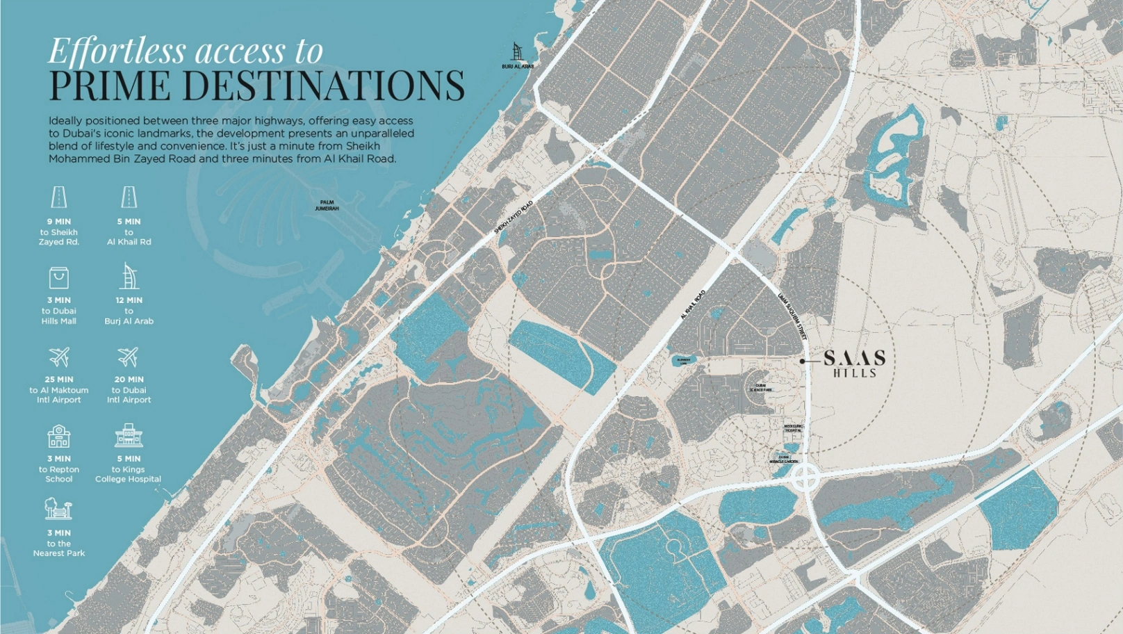 SAAS Hills, a prestigious new development by SAAS Properties, is set within the innovative Dubai Science Park. Comprising two elegant towers, Tower A and Tower B, SAAS Hills offers a range of luxury studios, 1- to 3-bedroom apartments, and exclusive sky-villas, designed to cater to the high standards of urban sophistication. The design of SAAS Hills Dubai Science Park is rooted in modern architectural aesthetics, where form and function blend seamlessly. Apartments at SAAS Hills Dubai Science Park feature open-plan interiors, floor-to-ceiling windows for optimal natural light, and high-end finishes throughout. Each unit in this property at SAAS Hills is equipped with a private pool and a fully furnished kitchen, underscoring the commitment to luxury and privacy. The amenities at SAAS Hills Dubai Science Park are equally impressive and include an outdoor pool, fully equipped gym, children’s play area, sauna, jacuzzi, and spa facilities. Residents can also enjoy a sandy pool, a unique climbing wall, a private cinema, and various recreational courts, including basketball and padel. Business professionals will benefit from the development’s dedicated business hubs and co-working spaces, while ample retail spaces cater to essential shopping needs.Located at Dubai Science Park, SAAS Hills offers residents access to one of Dubai’s most future-forward communities. Known for its role in fostering technological and scientific innovation, Dubai Science Park also serves as a thriving residential and commercial hub. Nearby, residents have access to various amenities, from shopping centers, such as Mall of the Emirates (a 15-minute drive), to high-quality healthcare facilities and diverse dining options. For families, Dubai Science Park is close to reputable educational institutions and has green spaces that provide a refreshing break from the urban landscape. The community's proximity to Al Barsha South and Motor City enhances convenience with additional options for leisure and entertainment, making property at Dubai Science Park ideal for both residents and investors.
