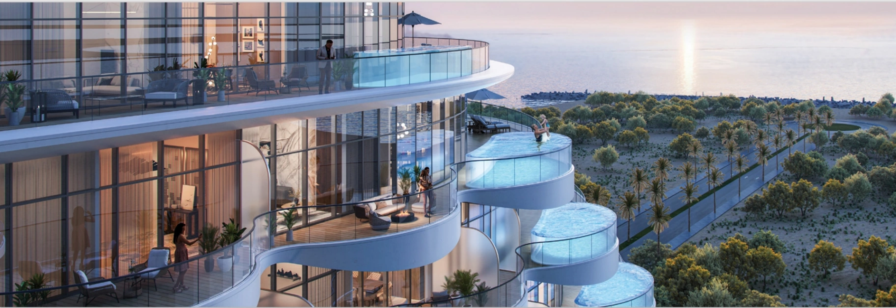 BNW Developments Aqua Arc stands out for its seamless integration of natural beauty and architectural innovation. Inspired by the breathtaking landscape of Jais Mountain and the organic forms of valleys, the project features cascading water elements and mountain cavern-like roof designs. The property at BNW Developments Aqua Arc boasts luxurious amenities such as double-height lobbies and private pools, creating a sanctuary where coastal tranquility meets modern luxury. Each unit is designed with meticulous attention to detail, ensuring residents enjoy the highest standards of comfort and elegance. The interiors include sleek, modern kitchens, expansive living areas, and serene bedrooms, all aimed at providing a harmonious living environment.Residents of property at Aqua Arc have access to an array of amenities, including a rooftop pool, platinum gym, steam and sauna rooms, walking trails, a kids' splash pad, and a BBQ area. The development also features an amphitheater and a recreational area, ensuring there are plenty of leisure options available.