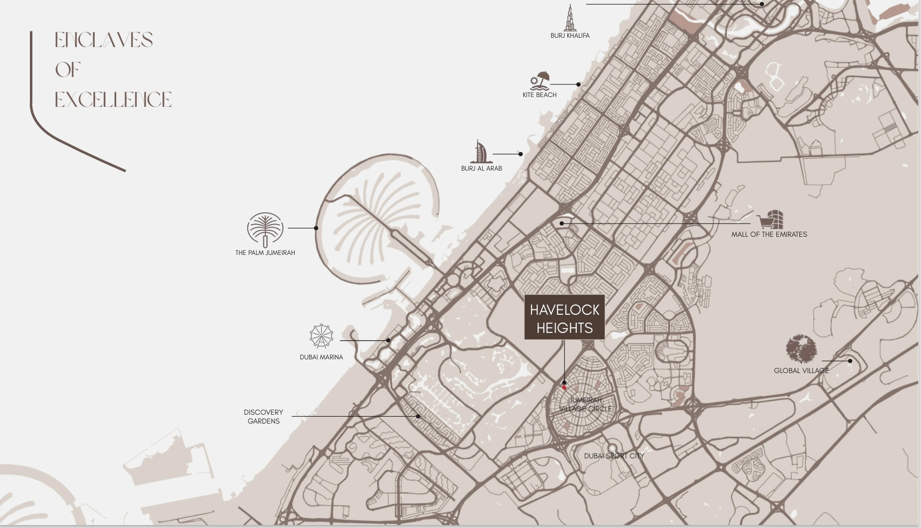 Havelock Heights, a distinguished residential development by AA & HMB Real Estate Development, is set in the vibrant and strategically located community of Jumeirah Village Circle (JVC), Dubai. This 25-story tower, scheduled for handover in Q3 2026, offers a compelling blend of modern convenience, quality, and investment potential, making it an ideal option for those seeking property in Dubai with assured returns and an enriched lifestyle experience.The architectural design of Havelock Heights showcases contemporary aesthetics, focusing on spacious layouts and premium finishes. The development offers a range of property types, including studios, one- and two-bedroom apartments, and expansive three-bedroom duplexes. Units range in size from 375 sqft (35 m²) for studios to 2,887 sqft (268 m²) for the largest duplexes, providing flexibility for different lifestyle needs. Each kitchen is equipped with modern cabinetry and high-quality appliances, adding both functionality and style to the living spaces, enhancing the overall residential experience.Residents at Havelock Heights enjoy a suite of amenities designed for a resort-like atmosphere, including an infinity pool, a state-of-the-art fitness center, a rooftop BBQ area, and a peaceful Zen Sky Garden. Additional facilities like an open-air cinema, a children’s play area, landscaped gardens, and multi-purpose lounges create a vibrant community experience and cater to various lifestyle preferences, making this property by AA & HMB Real Estate Development particularly appealing for families, professionals, and investors alike.The JVC location further adds value, combining central access with a serene residential environment. Situated near major thoroughfares, including Sheikh Mohammed bin Zayed Road and Al Khail Road, the development offers residents easy connectivity to Dubai Marina, Business Bay, and Downtown Dubai. The area is well-served by nearby amenities, such as the Circle Mall, international schools, dining options, and lush parks. The area’s community ambiance, complemented by its proximity to these facilities, makes the property at JVCan increasingly popular choice for a cosmopolitan lifestyle in a family-friendly setting.