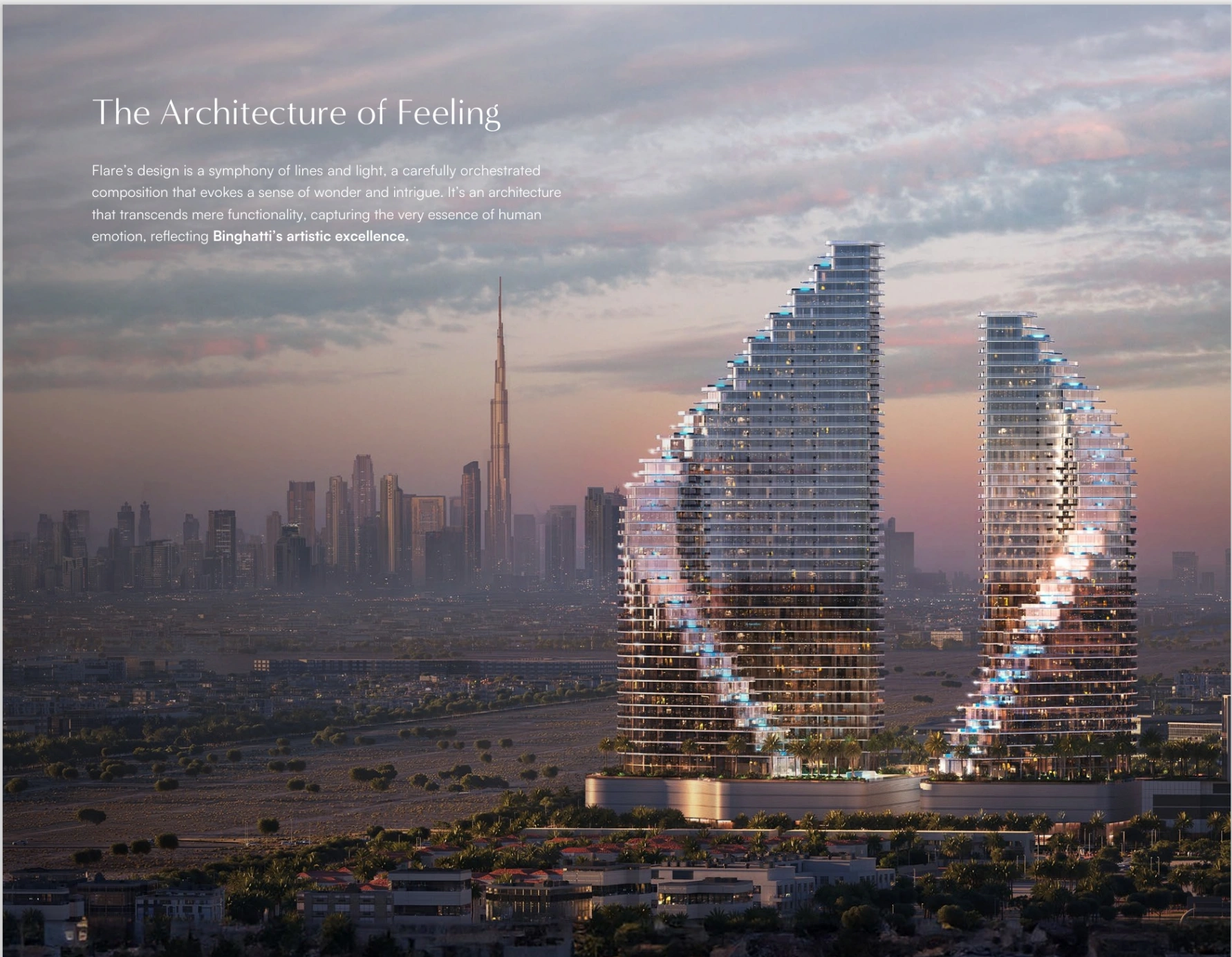 Binghatti Flare is a contemporary twin-tower residential project by Binghatti Developers, located in the vibrant community of Jumeirah Village Triangle (JVT), Dubai. Designed with a distinctive cascading façade, the development offers a mix of studios and 1-bedroom apartments tailored for modern urban living. Crafted with a forward-thinking approach, the architecture of the development merges elegance and sustainability. The twin towers integrate energy-efficient systems and eco-conscious design elements, emphasizing responsible urban development. Interiors are thoughtfully planned with spacious balconies that provide expansive views of surrounding landscapes, while premium materials and intelligent layouts ensure each home delivers comfort, practicality, and visual appeal.The development promotes a holistic lifestyle through an impressive range of amenities that go beyond conventional residential offerings. Residents can unwind in the Zen Yoga Garden, catch a film at the outdoor cinema, or enjoy social moments at the rooftop café. The project also includes commercial and retail zones, creating a well-rounded environment designed to support everyday needs, relaxation, and community interaction—perfect for individuals, couples, and growing families alike.Strategically positioned in one of Dubai’s emerging lifestyle hubs, the project offers excellent connectivity to key locations. Residents will benefit from proximity to Al Khail Avenue Mall and easy access to major business districts. Iconic landmarks such as Dubai Marina, Palm Jumeirah, and Downtown Dubai are just a short drive away, while efficient public transport options enhance the convenience of daily commuting and leisure travel.