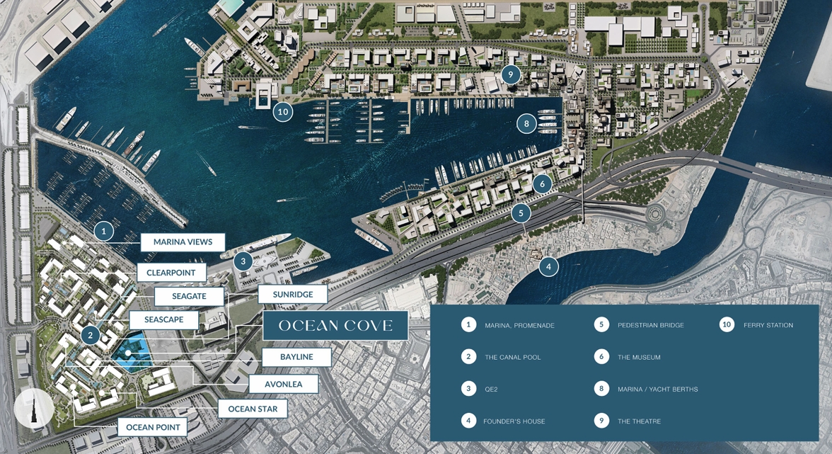 Discover Ocean Cove Ocean Cove, a prestigious 2-tower waterfront project by Emaar Properties, is set in the vibrant Rashid Yachts & Marina. It offers an assortment of apartments from 1 to 3 bedrooms, with sizes ranging between 786 sq. ft and 1,853 sq. ft. Each apartment will be designed with a private laundry room and one or more balconies, while units with 3 bedrooms will also include utility rooms.Residents of Ocean Cove enjoy access to premium recreational amenities, consisting of a swimming pool, gardens, a gym, a children’s play area, a waterfront promenade, sports facilities and retail & dining options.In addition, Ocean Cove inhabitants benefit from the leisure facilities offered by Rashid Yachts & Marina, including Dubai’s longest canal pool, a scenic boardwalk promenade, a children’s splash park, a waterfront plaza, and beyond.Strategically situated near Marina Cubes Street, Ocean Cove offers easy access to Dubai's most sought-after locales. A quick 20-minute drive connects residents to the DIFC, Downtown Dubai, and Dubai International Airport.The complex’s location a short walk from bus stops Caltex/Reservoir 1 and Caltex/Reservoir 2, provides seamless integration with Dubai’s extensive bus network, simplifying daily commutes.Nearby, residents have access to crucial amenities such as hospitals, schools, supermarkets, and nurseries, all under a 10-minute journey. Attractions close by include Little Diamond Nursery – Al Raffa, Aster Hospital Mankhool, New Academy School, and Fresh Plus market, making living at Ocean Cove convenient. Additionally, the Al Shindagha Museum and Heritage Village offer enriching cultural experiences, just moments away. Immerse yourself in the serene beauty of Ocean Cove, where nature and city life come together to create a truly captivating atmosphere. Nestled in the heart of Rashid Yachts & Marina, Ocean Cove offers a refined lifestyle that blends the peaceful charm of a luxurious waterfront community with the vibrant, diverse energy of Dubai. It’s a place where luxury meets comfort, all set against the tranquil backdrop of a lush greenery. Making life even easier, you’ll find a clinic right next to the property and a school just a short walk away, bringing added convenience and peace of mind to your everyday living. Every day at Ocean Cove offers an elevated experience of luxury and refinement. It's a haven where appreciating the finer things in life is a daily practice. Indulge in the tranquilly of our signature pool, reminiscent of the world's most exclusive resorts. The lush gardens provide a peaceful escape, combining the energy of the city with the tranquilly of nature. Our sports and recreational amenities are designed specifically for your enjoyment and relaxation, making Ocean Cove the pinnacle of comfort and elegance. Ocean Cove architecture merges Dubai's visionary spirit with classic elegance and modern style. Using nature-inspired premium materials, it reflects the city's architectural evolution while adding cultural depth. One-bedroom suites, perfect for singles or couples, feature spacious layouts, open kitchens, and private balconies. Larger two- and three-bedroom units include en-suite bathrooms, ample wardrobe space, and expansive balconies. Indulge in the exquisite amenities that Ocean Cove has to offer, tailored to meet the highest standards of luxury. Enjoy the ultimate rejuvenation experience at our cutting-edge fitness centre, engage in exhilarating matches on our top-notch sports courts, or unwind by the breathtaking pool. Experience the utmost convenience and comfort with our ample parking facilities.