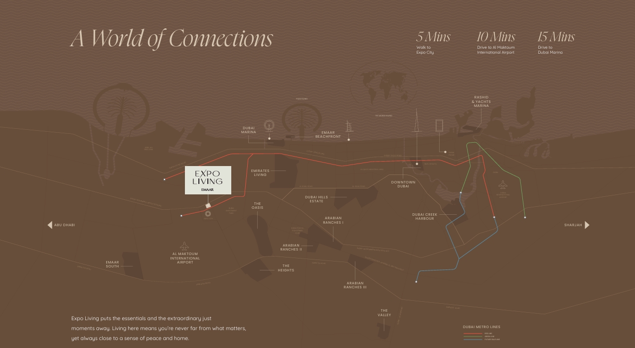 Expo Living is an innovative residential community set within the dynamic Dubai South landscape, just a short walk from Expo City—Dubai’s burgeoning center for exhibitions, business, and global events. This visionary development, a partnership between Emaar Properties and Dubai World Trade Centre (DWTC), redefines the concept of urban living by blending futuristic design, state-of-the-art architecture, and sustainable principles into one cohesive environment. Designed for those who value both modern comfort and natural tranquility, Expo Living features curated amenities aiming to nurture wellness, connectivity, and a balanced lifestyle. Residents enjoy beautifully landscaped courtyards, inviting green spaces, and innovative social zones that encourage relaxation and community interaction. The proximity to Expo City puts residents at the epicenter of creativity and innovation, while the serene environment fosters a sense of calm amidst the excitement of city life.At the heart of this pioneering enclave is Terra Heights—a collection of contemporary apartments that integrates smart architecture with lush landscaping. Terra Heights embodies refined urban living with open-concept layouts, ample natural light, and vibrant communal areas where neighbors can connect and thrive. Each apartment is thoughtfully designed to optimize comfort, functionality, and style, making it a top choice for investors and homebuyers seeking luxury property or prime investment in Dubai.Terra Heights is ideally situated for accessibility and convenience. Just a 15-minute walk to Expo City, residents are also only a 15-minute drive from Al Maktoum International Airport, ensuring quick connections for business and travel. Iconic destinations such as Palm Jebel Ali are within 25-30 minutes, and major Dubai landmarks are easily accessible, blending dynamic city living with peaceful residential retreat.Expo Living at Terra Heights offers more than just a residence—it provides a unique environment where daily life is enriched by connectivity, innovation, and a close-knit community spirit. Residents enjoy the vibrancy of Expo City combined with the tranquillity and comfort of home, making it the perfect choice for those seeking modern elegance, strategic location, and exceptional investment potential in Dubai’s thriving real estate market.
