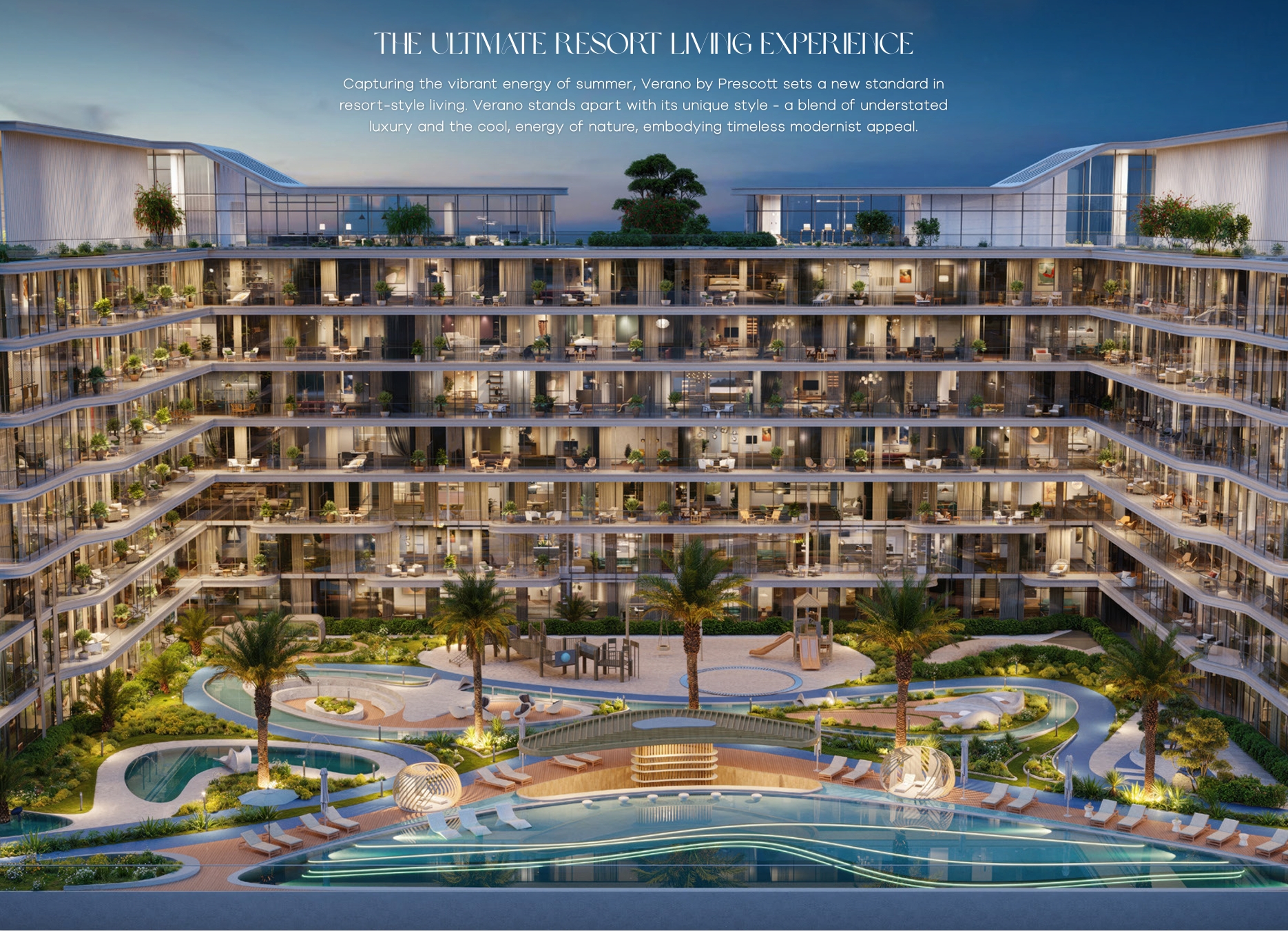 Prescott Verano offers a variety of thoughtfully designed floor plans of apartments, catering to the diverse needs of residents. Each apartment is spacious, functional, and features modern design elements that prioritize both aesthetics and practicality. Open-concept living areas flow into well-appointed kitchens, making them perfect for family living or hosting guests. The units feature high-quality finishes, large windows that allow natural light to flood the space, and private balconies that offer stunning views of the surrounding skyline and greenery. The residences ensure comfort, with ample storage and intelligently designed spaces to enhance everyday living.All properties at Verano by Prescott are equipped with a smart home system that allows residents to control lighting, climate, and security from their mobile devices. Kitchens come with built-in furniture and Bosch appliances, while bathrooms feature premium Kohler fixtures. Built-in storage solutions and smart technology make the apartments at Prescott Verano highly functional.Residents of Prescott Verano will enjoy exclusive resort-style amenities. The complex includes a beach-style pool with a bar, family lounges with fire pits, and a covered sauna. The landscape design features green areas for relaxation and meditation, including a Zen garden and hammock lawns. For fitness enthusiasts, there are jogging tracks, an outdoor gym, and a yoga area. Children can enjoy dedicated play areas, trampolines, and a splash park. The ground floor of Verano by Prescott offers retail spaces with shops and cafes. The rooftop is designed as a recreational zone with an open-air gym, a clubhouse, a mini cinema, and areas for table tennis and billiards.