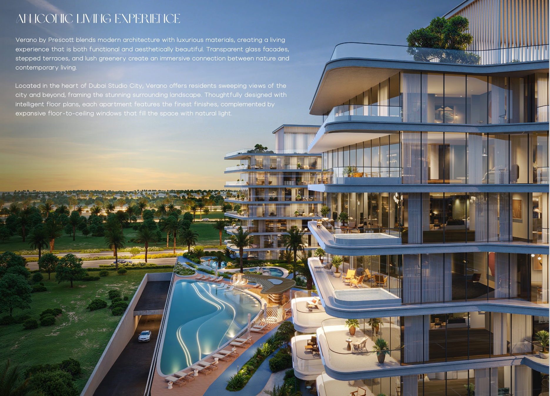 Verano by Prescott is a new residential project at Dubai Studio City. The key features of the complex include modern architecture and thoughtfully designed layouts that provide both comfort and coziness. Prescott Verano has nine floors with plenty of open spaces and natural light. Transparent glass facades and cozy terraces create a sense of airiness, allowing residents to enjoy the beauty of nature. The finishing materials include wood and stone, while the interiors are done in light, natural tones.The properties at Prescott Verano include studios and 1-3 bedroom apartments. The project offers 258 residential units, with some apartments featuring a maid’s room and a dedicated storage space. The size of the apartments at Verano by Prescott ranges from 427 sqft (40 m2) to 1,872 sqft (174 m2), making it easy to find a suitable option for both personal use and investment purposes.All properties at Verano by Prescott are equipped with a smart home system that allows residents to control lighting, climate, and security from their mobile devices. Kitchens come with built-in furniture and Bosch appliances, while bathrooms feature premium Kohler fixtures. Built-in storage solutions and smart technology make the apartments at Prescott Verano highly functional.Residents of Prescott Verano will enjoy exclusive resort-style amenities. The complex includes a beach-style pool with a bar, family lounges with fire pits, and a covered sauna. The landscape design features green areas for relaxation and meditation, including a Zen garden and hammock lawns. For fitness enthusiasts, there are jogging tracks, an outdoor gym, and a yoga area. Children can enjoy dedicated play areas, trampolines, and a splash park. The ground floor of Verano by Prescott offers retail spaces with shops and cafes. The rooftop is designed as a recreational zone with an open-air gym, a clubhouse, a mini cinema, and areas for table tennis and billiards.Prescott Verano is located at Dubai Studio City, a highly developed community. Within walking distance are supermarkets, fitness clubs, pharmacies and restaurants. Business Bay and Dubai Marina can be reached by car in 20 minutes and Dubai International Airport is just 25 minutes away. There are two new metro stations under construction in the area, which will improve transportation accessibility.