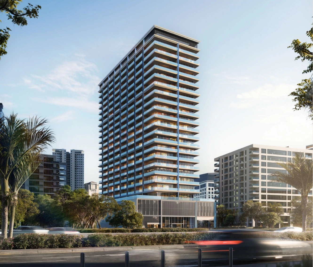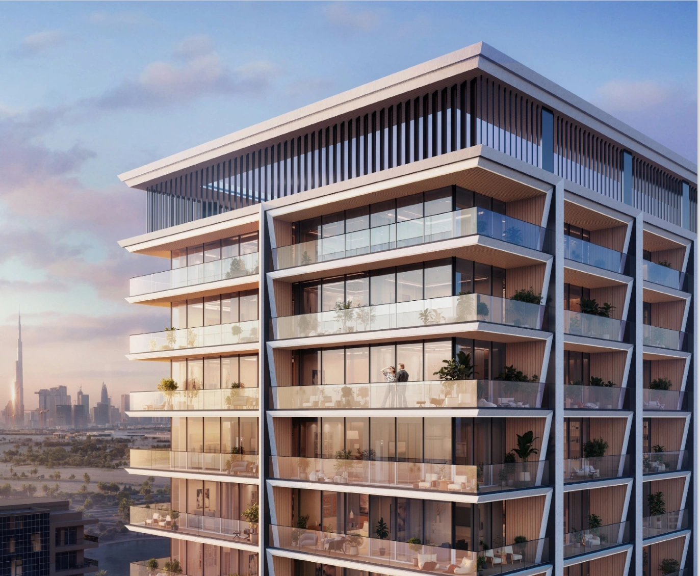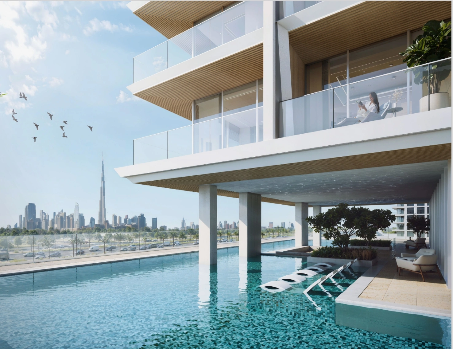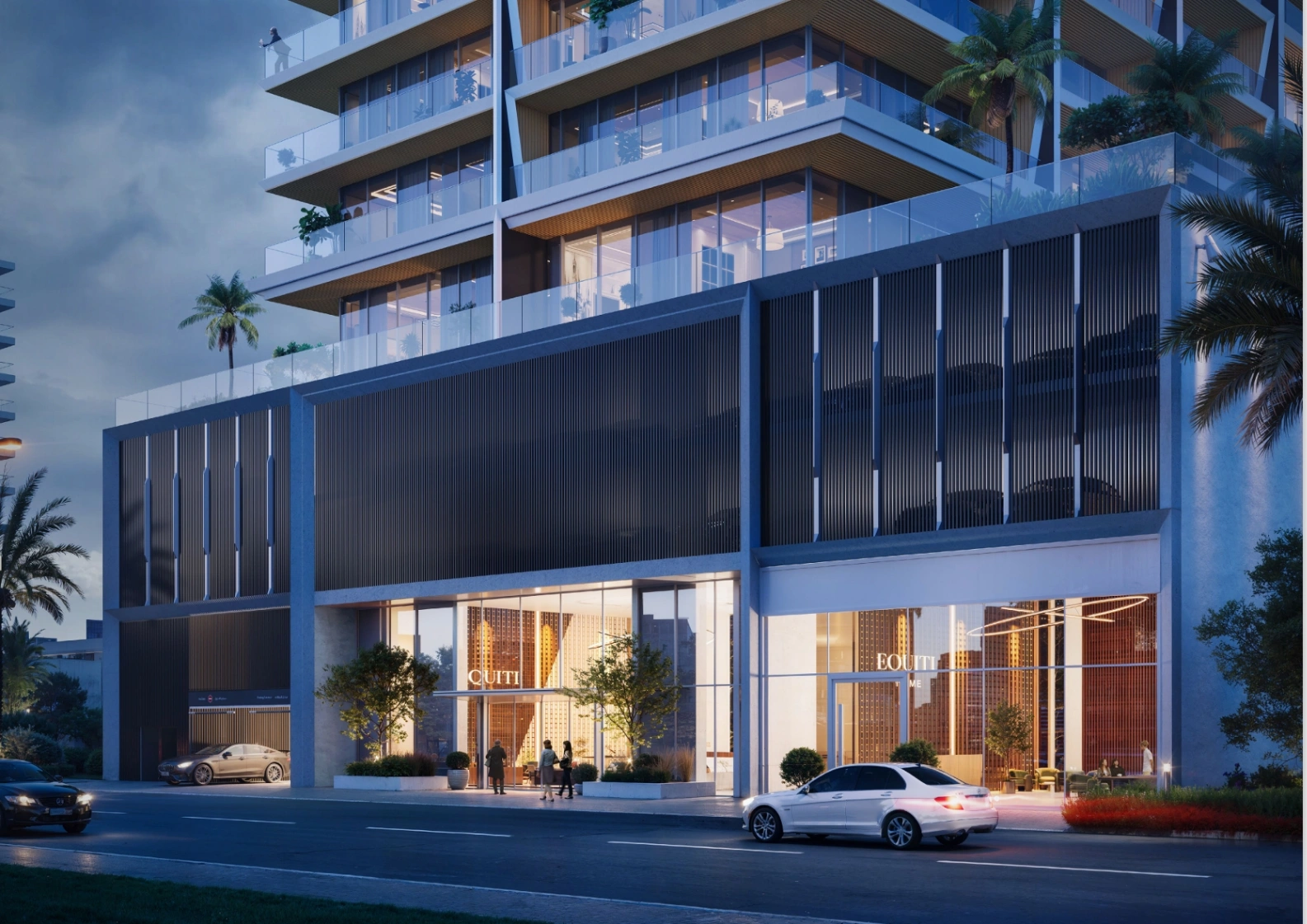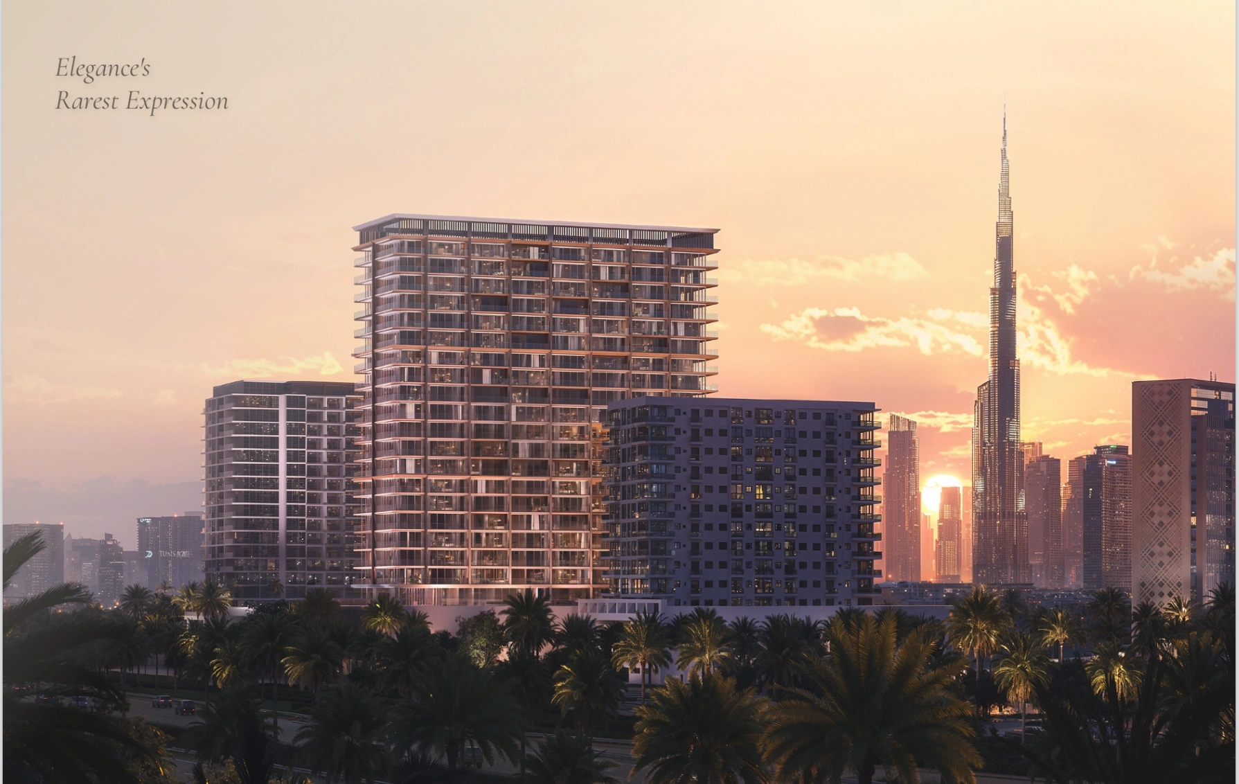 The architectural design exudes timeless elegance, where the façade offers harmonious blend of modern materials like crystalline glass, metal mesh, and brushed brass, creating a striking visual impact. It is a building that stands out, yet its beauty is subtle enough to blend seamlessly with Dubai's skyline. The interiors of the apartments reflect the same attention to detail. Every material has been hand-selected for its quality and aesthetic appeal, from the wood porcelain in the living spaces to the exotic green porcelain and travertine in the bathrooms. The combination of these materials results in spaces that are not only visually stunning but also warm and inviting.The use of materials such as tan oak wood, black tinted glass, and corian surfaces in the apartments creates an atmosphere of understated elegance. These elements not only enhance the visual appeal of the living spaces but also offer durability and functionality. The seamless integration of indoor and outdoor spaces allows residents to enjoy the exclusive views of Dubai while experiencing the comfort of their homes.