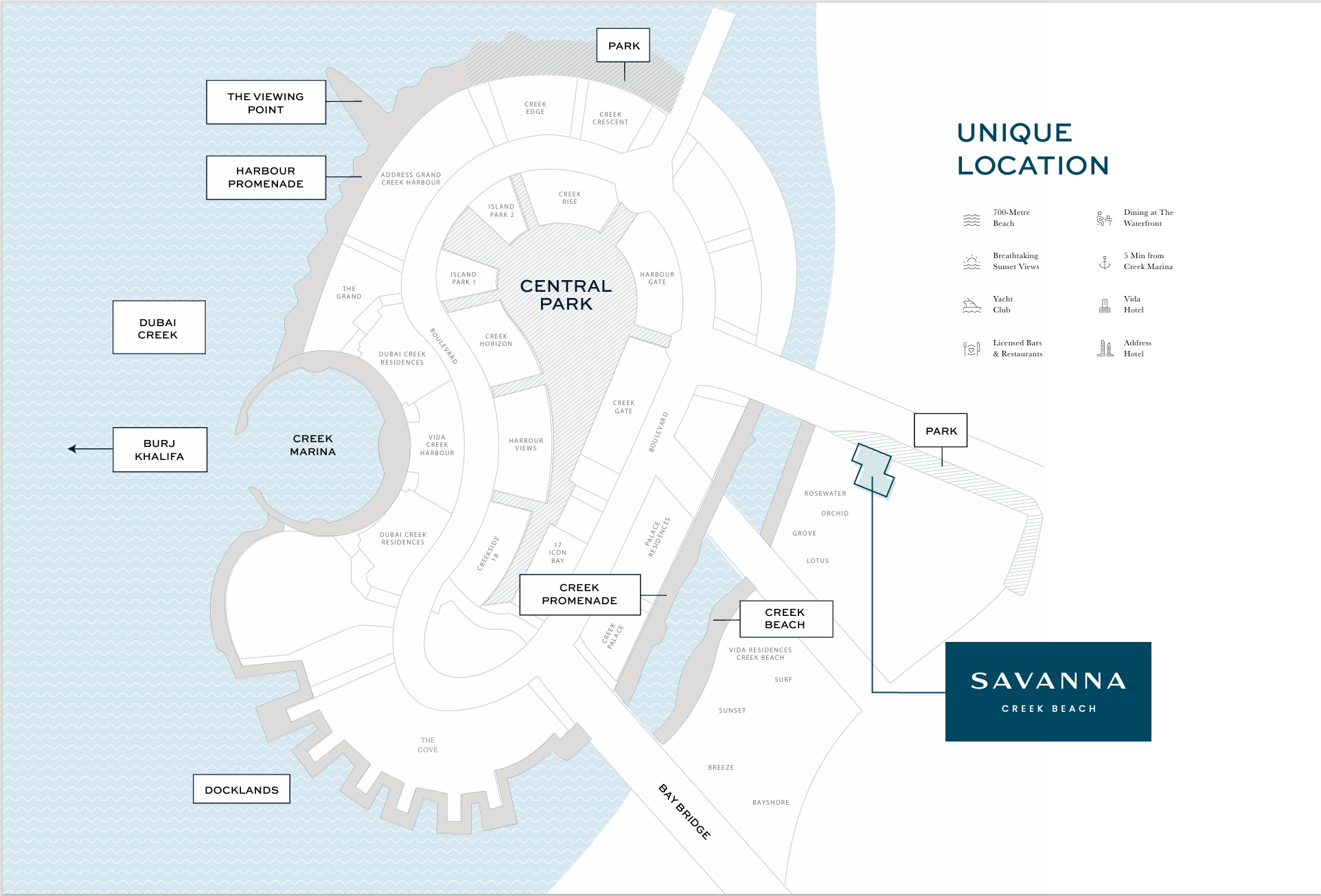 Dubai Creek Harbour is a vibrant waterfront community that seamlessly blends contemporary luxury with serene nature and innovative design. Residents experience a unique lifestyle, surrounded by iconic amenities like the Dubai Creek Marina, a dream destination for yachting enthusiasts. The nearby Ras Al Khor Wildlife Sanctuary, famous for its rich biodiversity and flamingos, offers tranquil lagoons perfect for birdwatching and peaceful nature walks.Ideally located, Dubai Creek Harbour provides convenient access to Downtown Dubai and Dubai International Airport, making both business commuting and leisure travel effortless. The development features picturesque promenades, top-tier dining options, schools, healthcare facilities, and is soon to benefit from the Dubai Metro expansion, ensuring exceptional connectivity across the city.The residential offerings at Dubai Creek Harbour are world-class, with a selection of apartments, penthouses, and luxury hotels such as Vida Creek Harbour, Address Harbour Point, and Palace Residences. Each property boasts breathtaking views of the Creek and the iconic Dubai skyline. Residents can enjoy gourmet dining experiences, relax by rooftop pools, or shop at boutique retail outlets, all within walking distance.One of the standout residential options is Savanna at Dubai Creek Harbour. This collection of elegantly designed 1-, 2-, and 3-bedroom apartments is set adjacent to a lush park, fostering a vibrant, family-friendly environment. The strategic location offers residents both tranquility and easy access to Dubai’s prime business, shopping, and entertainment districts.Nearby Creek Beach, Dubai’s first urban beach, provides a unique coastal retreat with 700 meters of white sand, an infinity pool, and stunning sunset views. This family-friendly haven is ideal for relaxation and recreation.Savanna’s amenities cater to every lifestyle need, including two town squares, a private swimming pool, a town center with shops and restaurants, a fitness center with private patio, outdoor play areas, a communal room, barbecue area, and a lush lawn. This dynamic community ensures an exceptional quality of life, balancing sophisticated living with abundant leisure options.