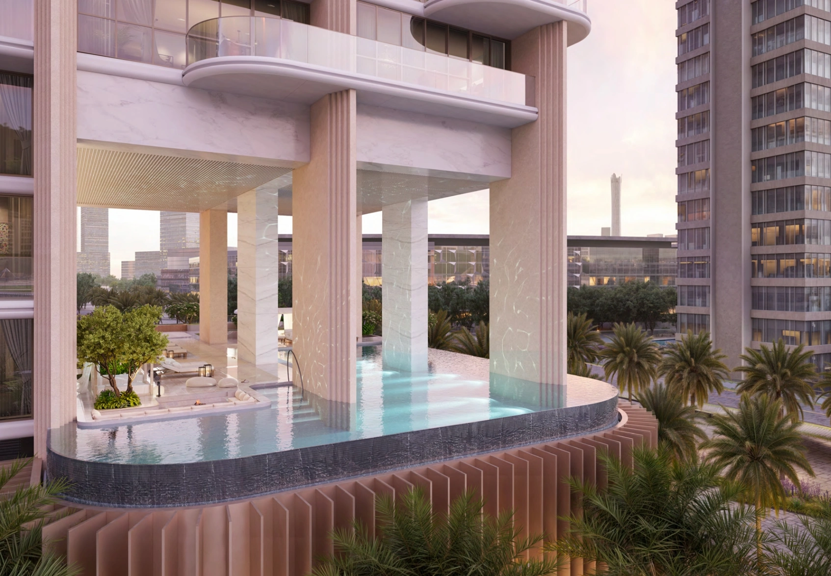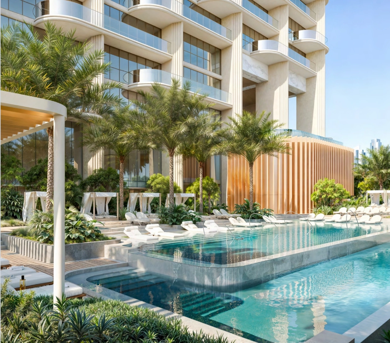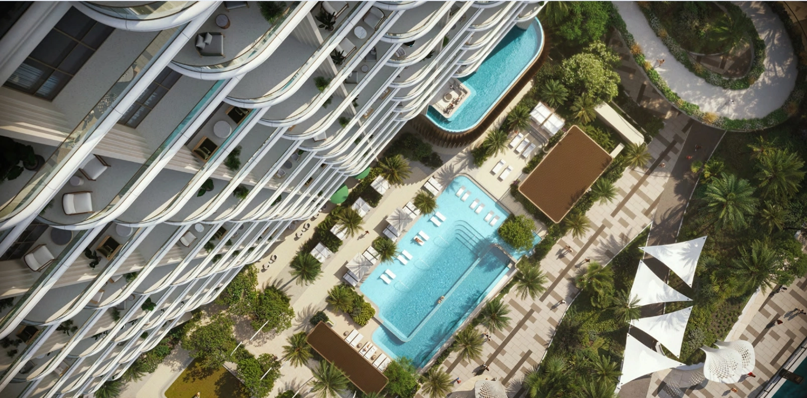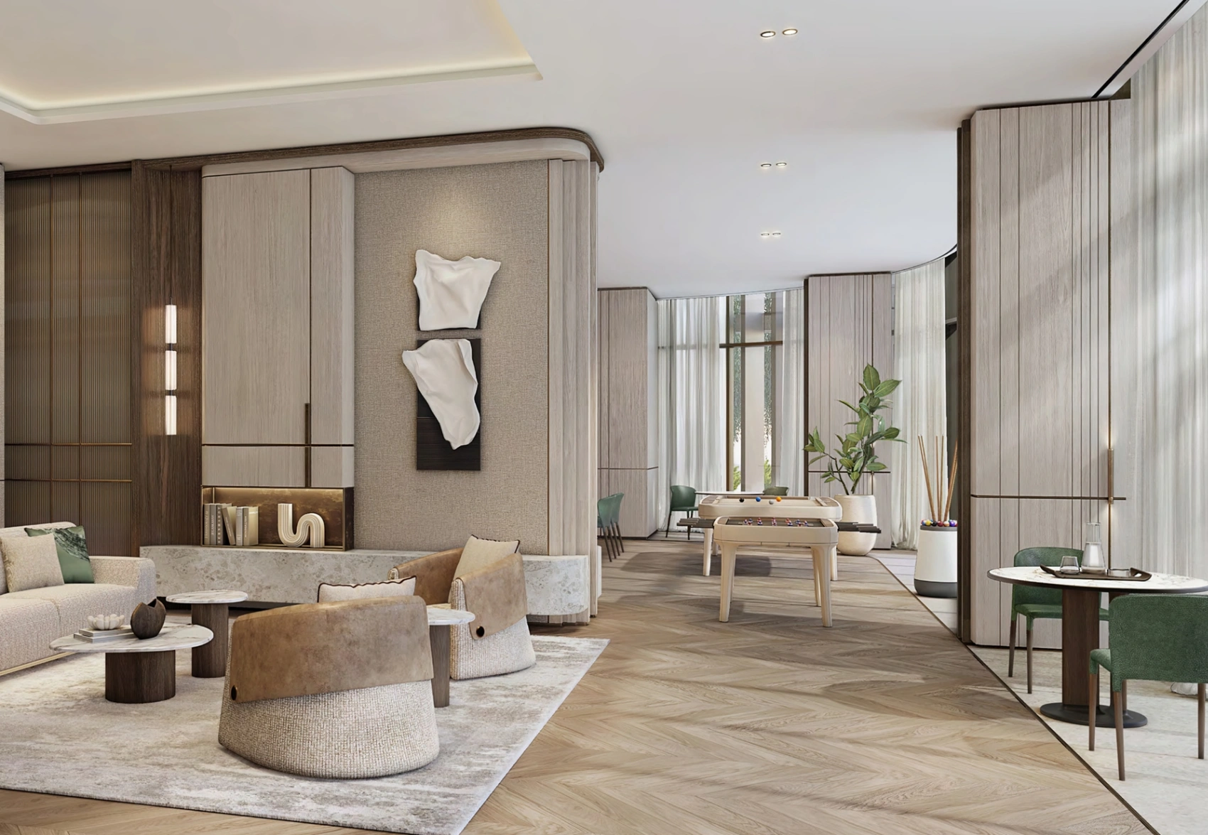 Organic Architectural Form: Balconies shaped like desert flower petals for a fluid, sculptural aesthetic.Premium Interiors: Warm tones, fine materials, and elegant bronze touches throughout.Modern Kitchens: Fully equipped with high-end appliances.Smart Home Integration: Selected features offer convenient control over home systems.High-Quality Finishes: Every residence showcases craftsmanship and attention to detail.Indoor Wellness: Entertainment rooms, flexible meeting spaces, co-working lounges, a fully equipped gym, spa rooms, and multi-purpose halls.Family-Friendly Zones: Kids’ learning spaces (indoor and outdoor), kids' pool, and green lawns.Resort-Style Outdoor Living: Ground-level community pool, second-level infinity pool, social cabanas, poolside suites, reading lawns, and bike parking.Grand Entrance: A double-height lobby designed to welcome with sophistication and style.