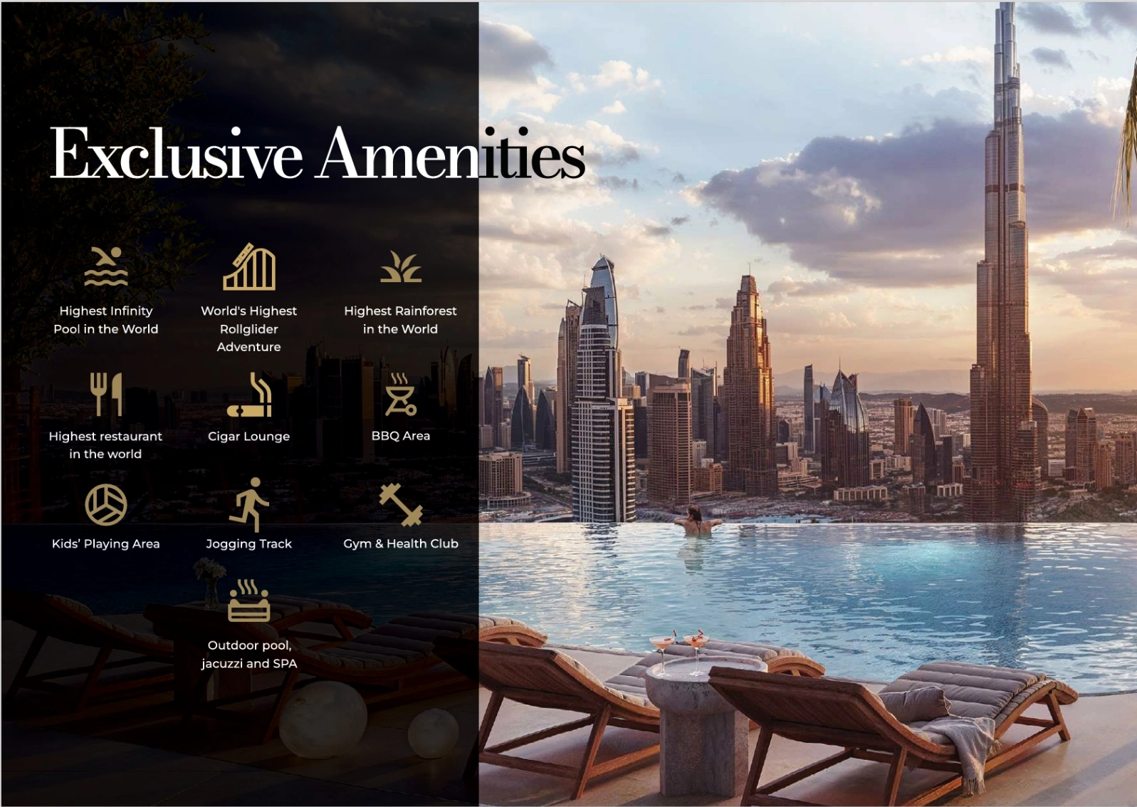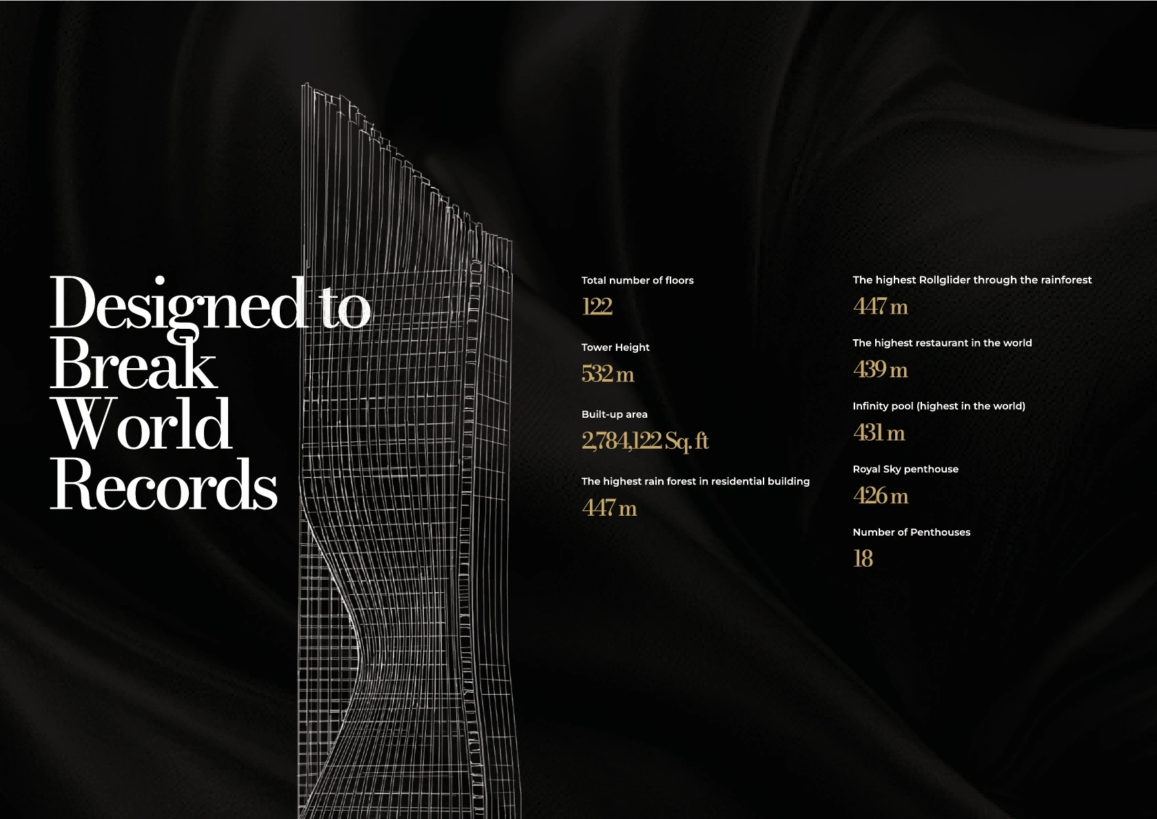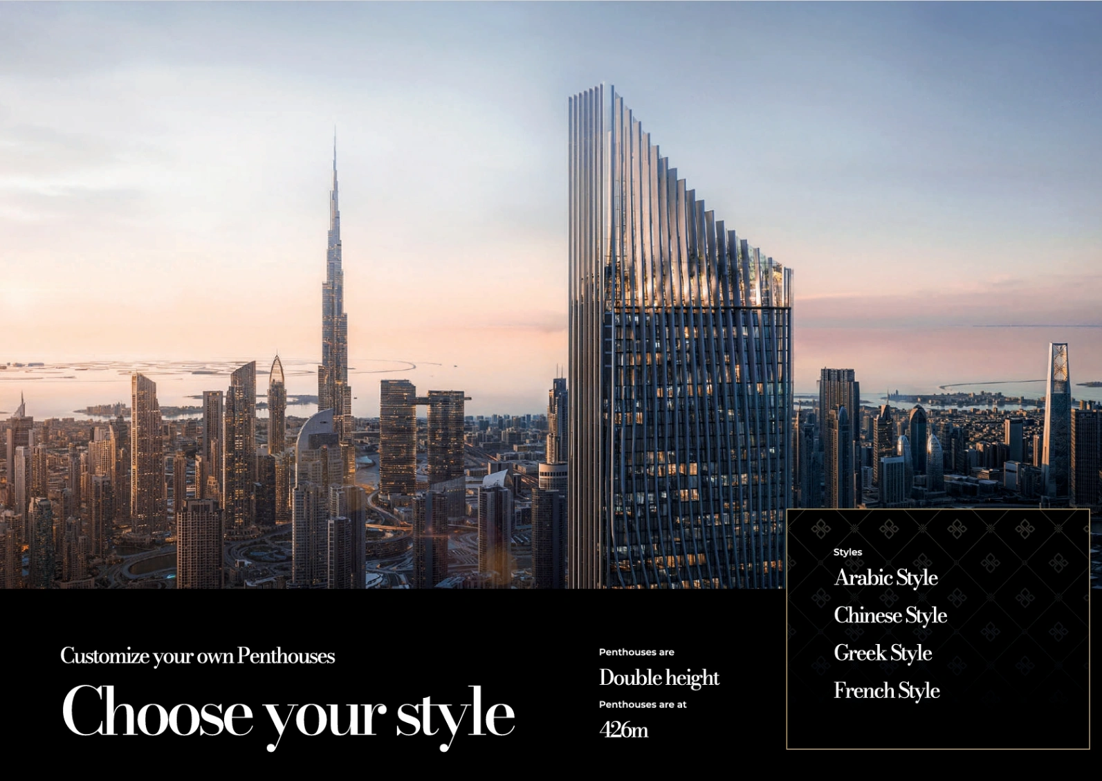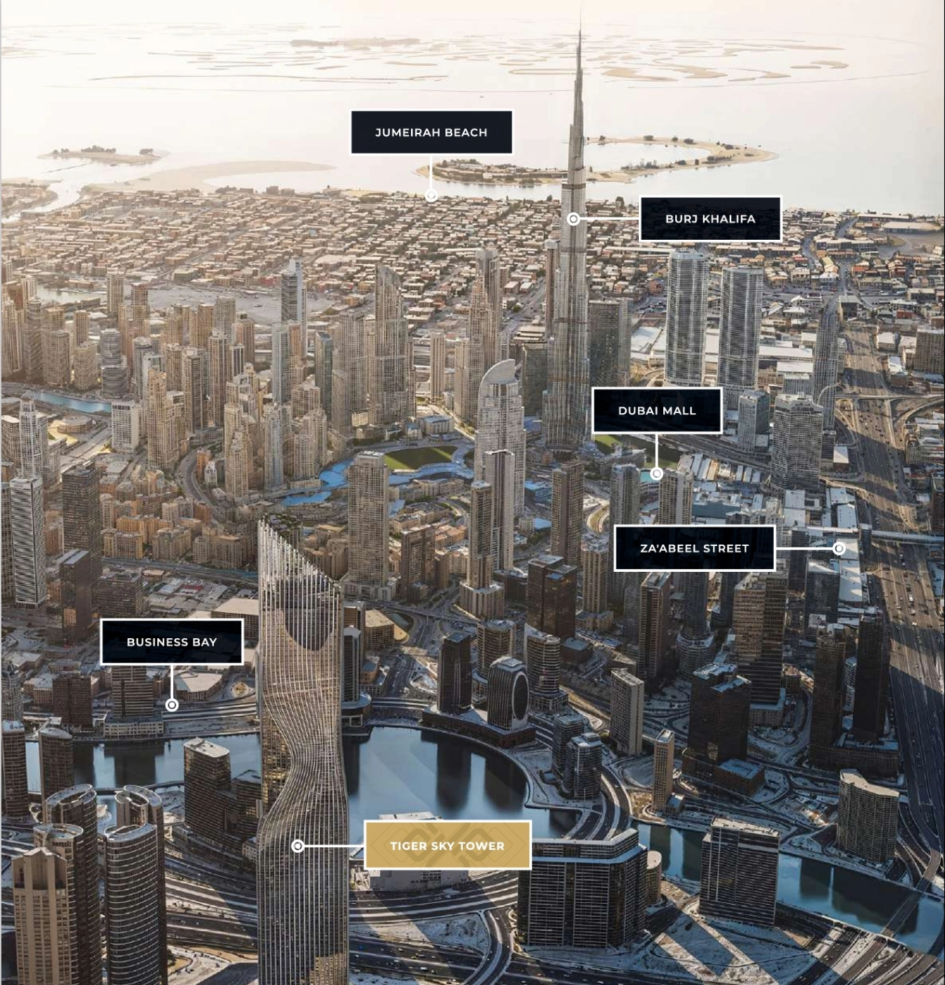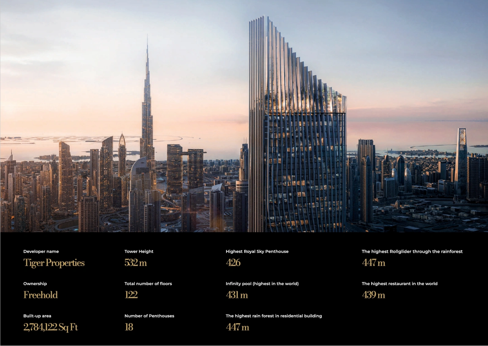 Tiger Sky Tower at Business Bay by Tiger Properties stands as an iconic addition to the illustrious Dubai skyline, presenting premium branded 1 to 4-bedroom apartments, penthouses and a royal sky penthouse. This shining golden 122-storey high-rise marvel, soon to grace the cityscapes, embodies a fusion of modern architectural brilliance and Emirati cultural heritage. Boasting clean lines and soaring heights, this newly launched tall tower promises to redefine luxury living in the heart of Dubai.Situated in the heart of Business Bay, the tower offers a strategic location that combines convenience with exclusivity. Residents will enjoy seamless access to Dubai’s major landmarks, business hubs, and leisure destinations. The tower’s surroundings are meticulously planned to enhance the urban living experience, featuring serene rooftop gardens, jogging tracks, and state-of-the-art fitness facilities.The tower’s allure extends beyond its impressive height. At 447 meters, the highest residential rainforest in the world provides an unparalleled living experience amidst lush greenery, while the world’s highest infinity pool at 431 meters offers breathtaking views of Dubai’s dynamic skyline. Dining reaches new heights at the 439-meter high restaurant, setting a new benchmark for fine dining experiences. These extraordinary features not only elevate the standard of living but also create a landmark destination for residents and visitors alike, blending luxury with nature in an unprecedented manner.The tower's interior showcases high-quality materials, with each unit featuring the prestigious Candy brand of appliances, ensuring the finest in home living. The penthouses, available in Arabic, Chinese, Greek, and French styles, offer a customizable living experience, allowing residents to create a home that reflects their personal taste and cultural affinities. This attention to detail and personalization underscores the commitment to providing a bespoke living environment that meets the highest standards of luxury and comfort.The allure is further amplified by its promise of an elevated lifestyle experience. This development is designed to cater to those who seek the pinnacle of luxury living, offering an unmatched blend of comfort, convenience, and elegance. The integration of the highest roll glider adventure through the rainforest at 447 meters adds an element of thrill and excitement, making it not just a home but a destination for extraordinary experiences. With its unmatched amenities, the tower stands as a testament to Dubai’s reputation for groundbreaking architectural achievements and luxurious living standards.