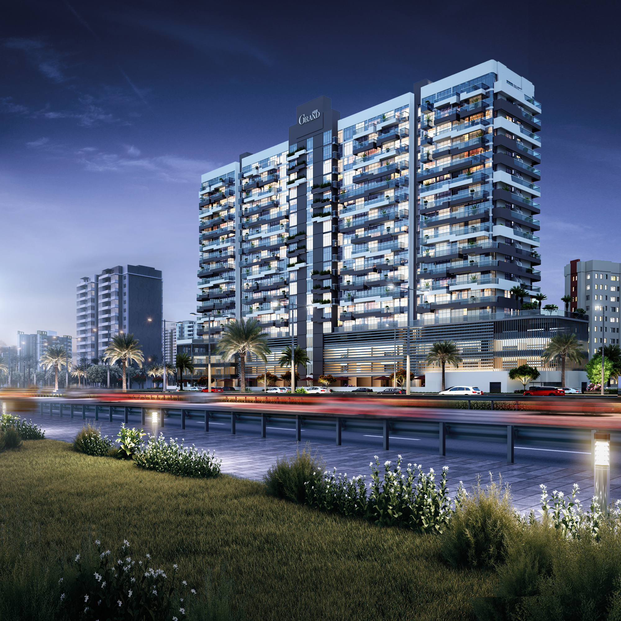 Azizi Grand is a meticulously designed residential development that rises with a configuration of 18 Levels Includes: 1 Basement+ G + 3 podium levels + 14 total floors, which includes 14 dedicated residential storeys. The project comprises 431 thoughtfully crafted residential units, offering a mix of studio, 1-bedroom, and 2-bedroom apartments, all designed to enhance space and functionality. Each unit features expansive end-to-end balconies, allowing residents to enjoy seamless indoor-outdoor living and soak in stunning vistas. The views from Azizi Grand are among its most compelling features, offering panoramas of the Dubai Sports City skyline, lush green landscapes, community courtyards, and even distant glimpses of the Dubai skyline.The architectural design within each apartment at Azizi Grand exemplifies a modern, minimalistic approach that prioritizes functionality without compromising on elegance.The kitchen spaces are designed with open-plan layouts, creating a seamless transition to the dining and living areas.They feature premium countertops, sleek cabinetry, and integrated high-end appliances, offering both visual appeal and practicality. The living areas are spacious and bathed in natural light, thanks to floor-to-ceiling double-glazed windows that not only frame stunning views but also enhance energy efficiency. The design emphasizes clean lines, soft ambient lighting, and neutral tones to evoke a warm and inviting atmosphere. In the bathrooms, attention to detail is evident through the use of exquisite tiling, built-in shelving, and contemporary fixtures. These spaces are minimalistic yet luxurious, with cleverly integrated storage and thoughtful layouts that elevate everyday routines into experiences of comfort and refinement.